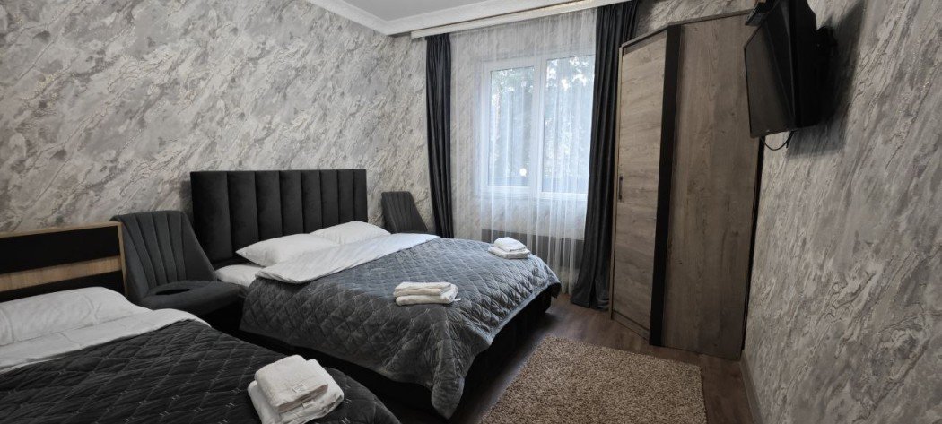 - спальни: двуспальная кровать, прикроватные тумбочки, шкаф, телевизор.