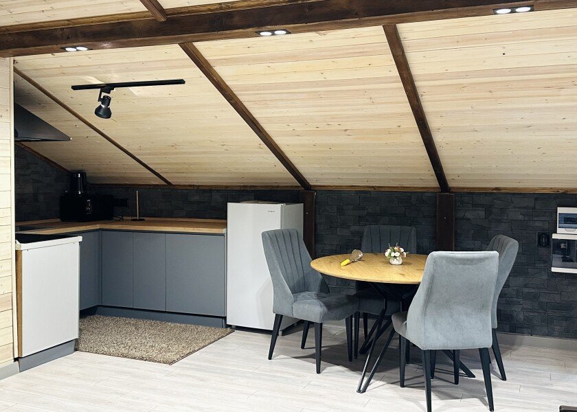- На первом этаже большой стол ,чтобы разместить всю компанию.