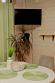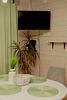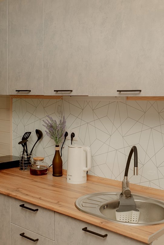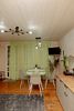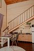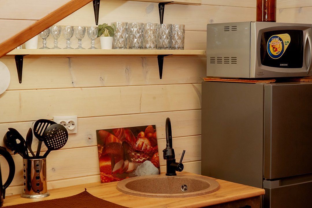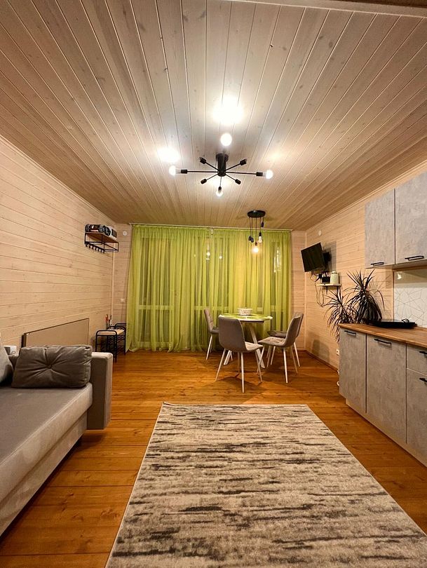 На первом этаже – просторная гостиная с диваном и кухонной зоной, оборудованной всем необходимым (холодильник, чайник, индукционная плита, посуда, моющие средства). Также на первом этаже находится санузел и спальня с большой двуспальной кроватью.