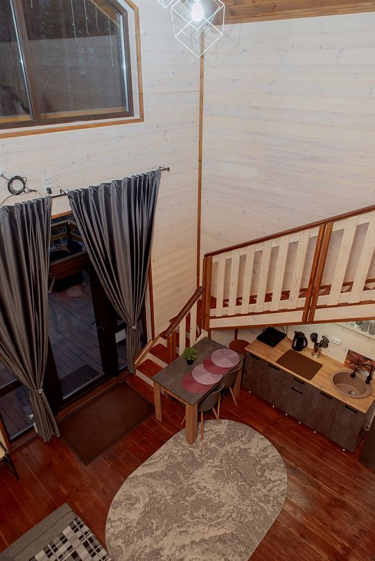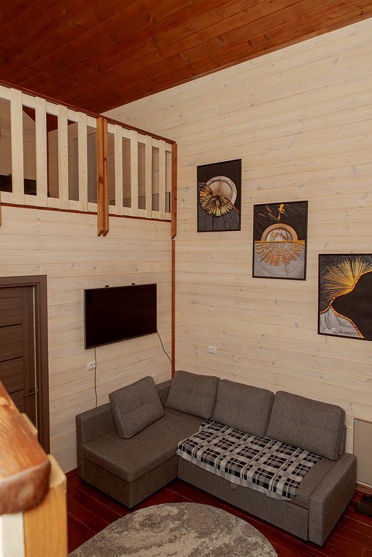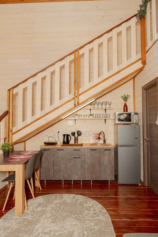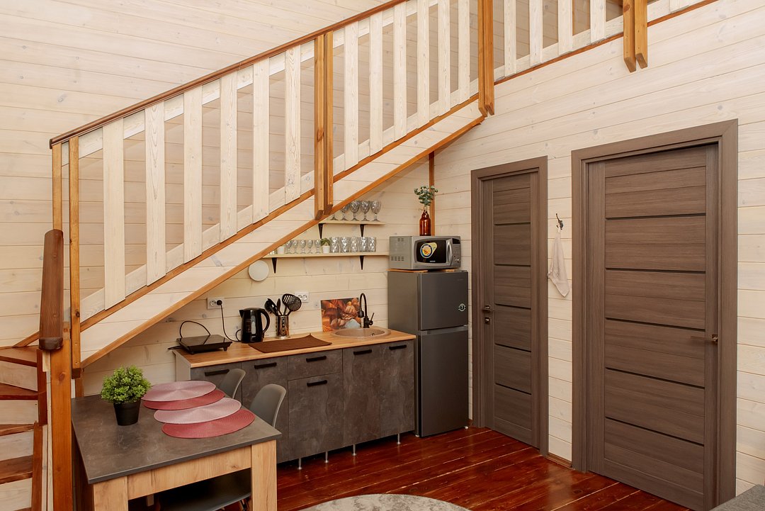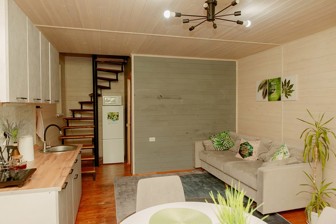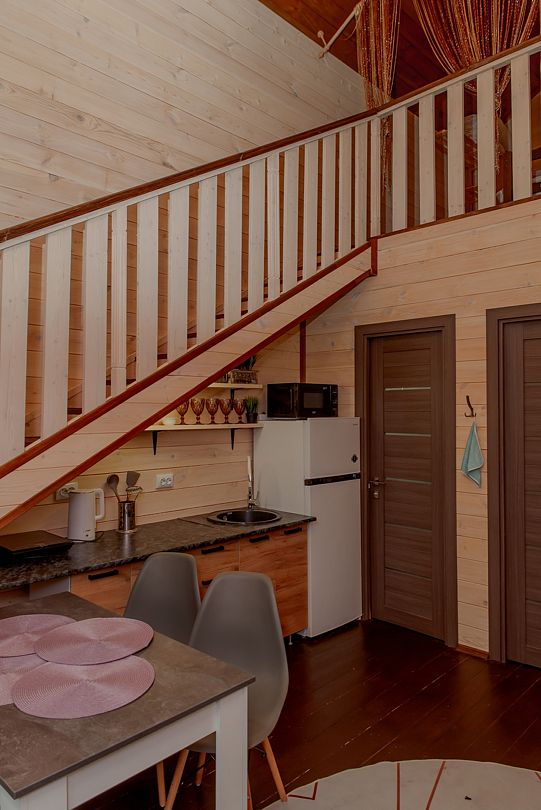 На первом этаже — просторная гостиная с диваном и кухонной зоной, оборудованной всем необходимым (холодильник, чайник, индукционная плита, посуда, моющие средства). Также на первом этаже находится санузел и спальня с большой двуспальной кроватью.