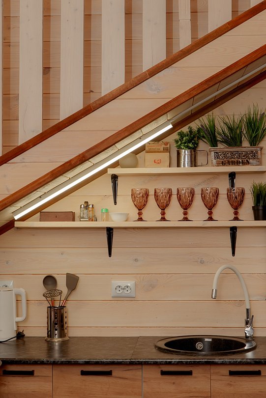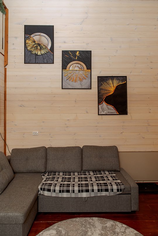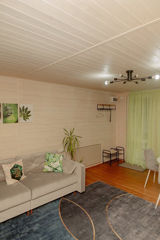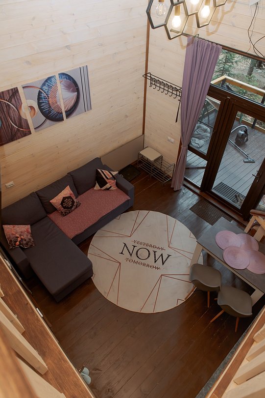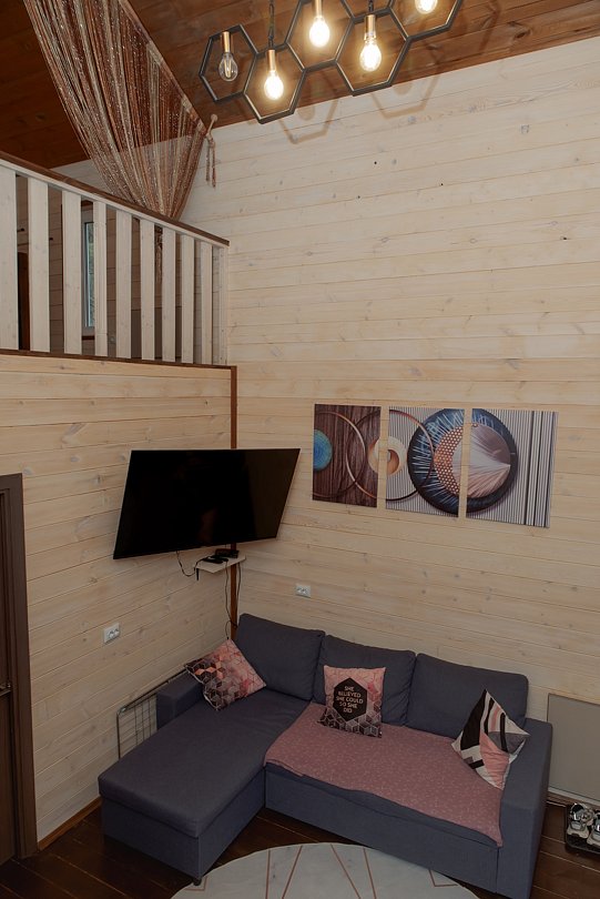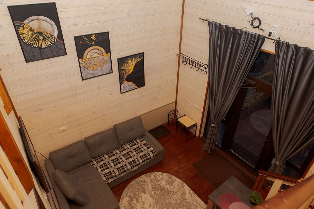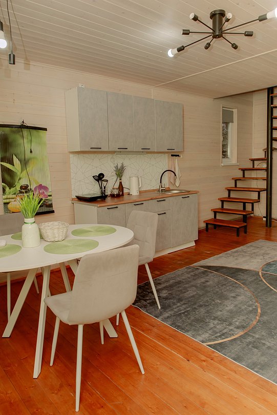 На первом этаже — просторная гостиная с диваном и кухонной зоной, оборудованной всем необходимым (холодильник, чайник, индукционная плита, посуда, моющие средства). Также на первом этаже находится санузел и спальня с большой двуспальной кроватью.