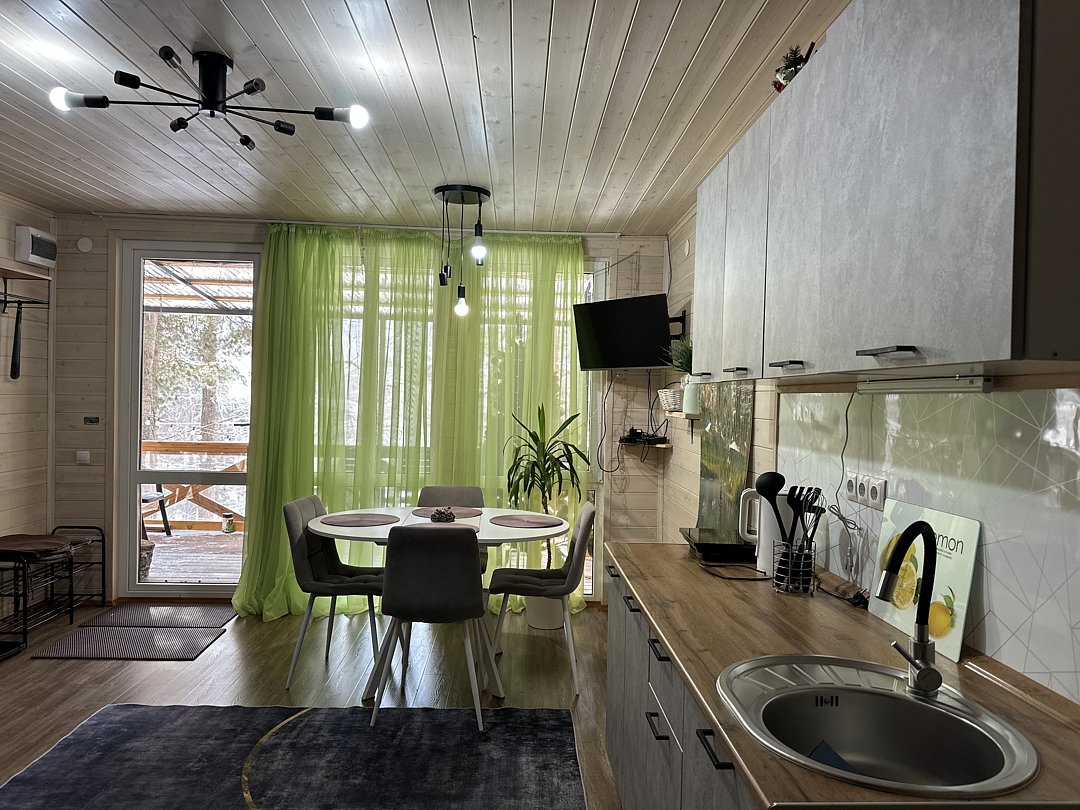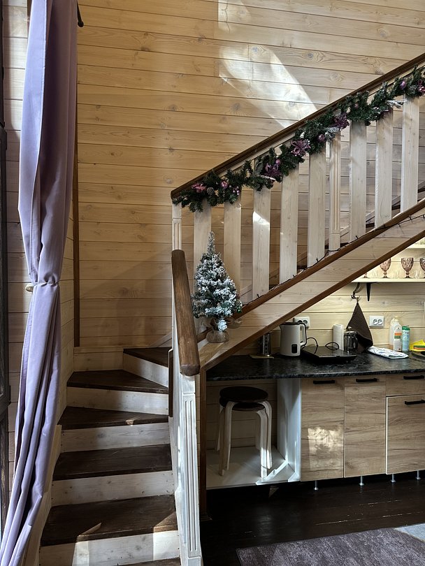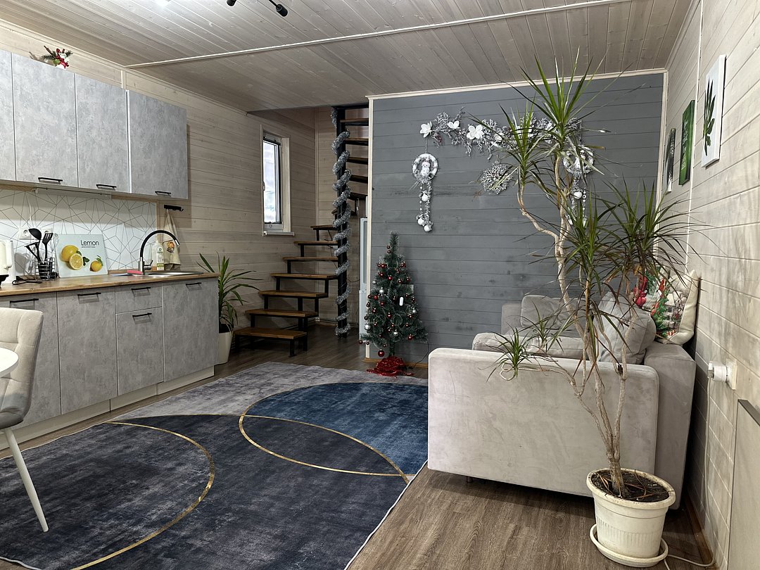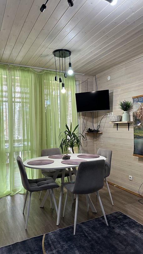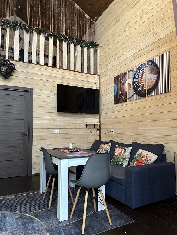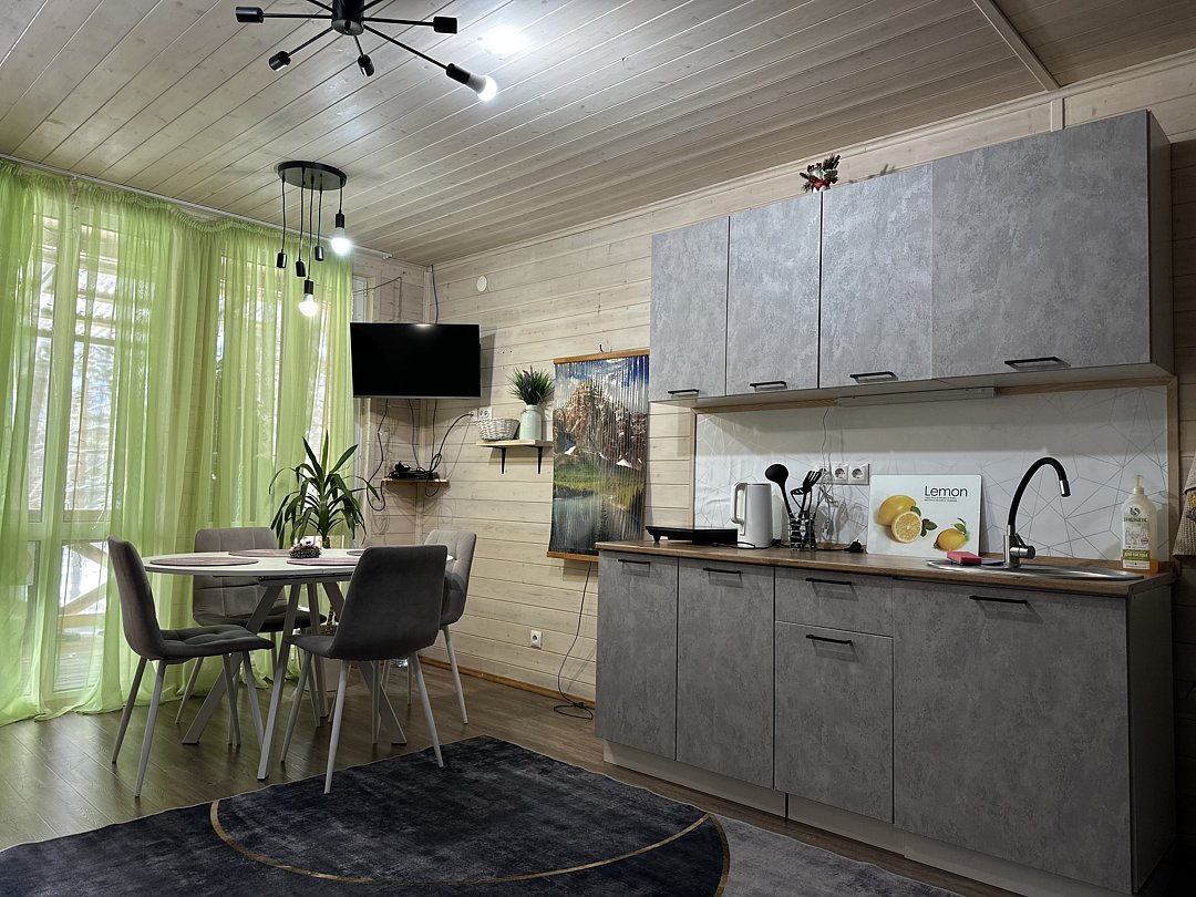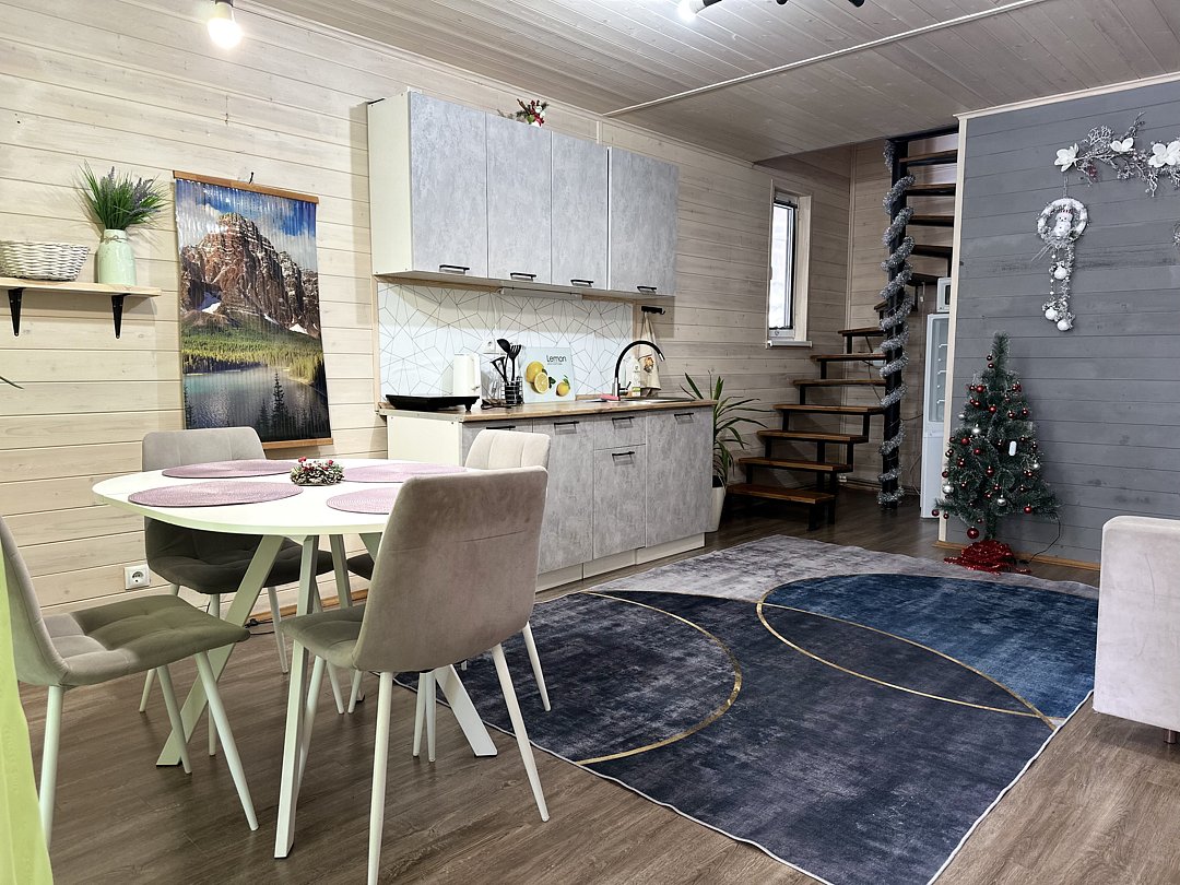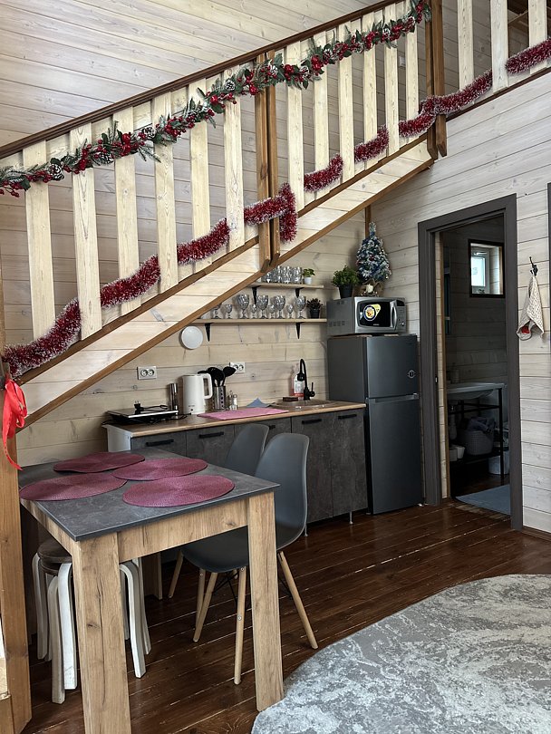 Внутри дома гостей ждет все необходимое для комфортного проживания. Просторная гостиная, объединенная со столовой, идеально подходит для дружеских встреч и семейных ужинов. Кухня с современными удобствами и мангалом приглашает вас готовить и делиться гастрономическими шедеврами в кругу семьи.
