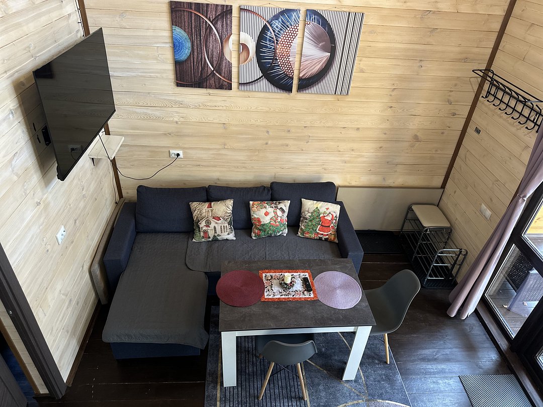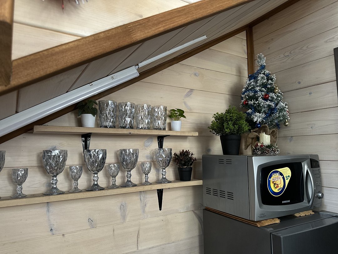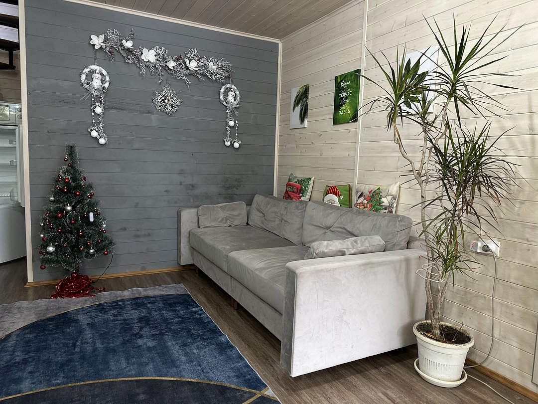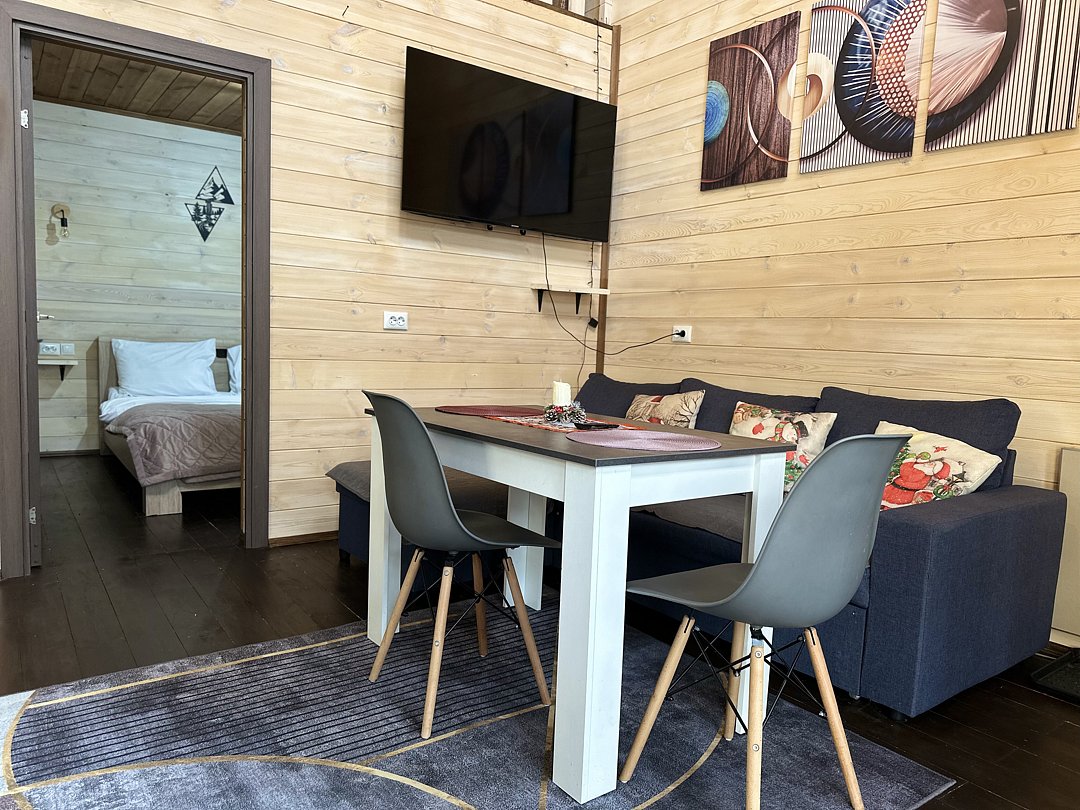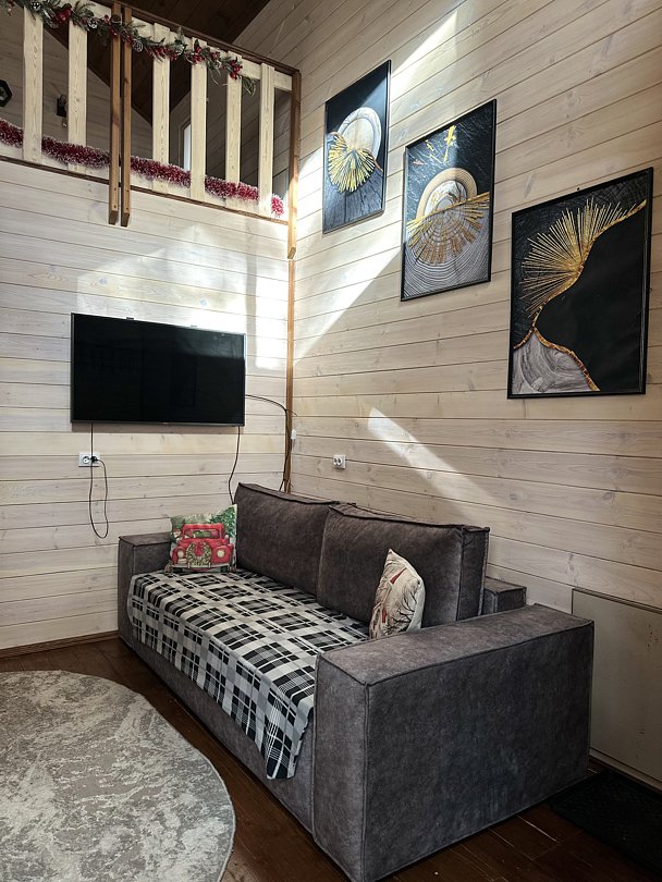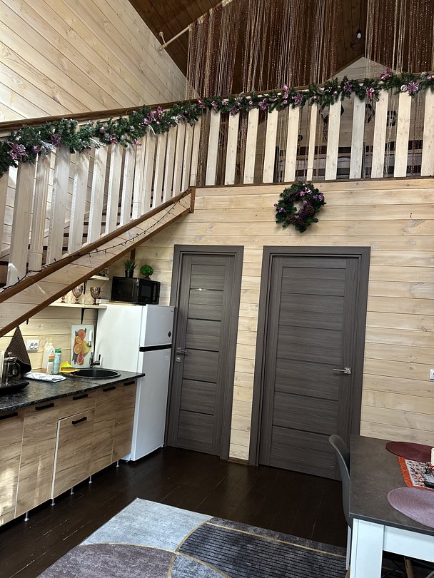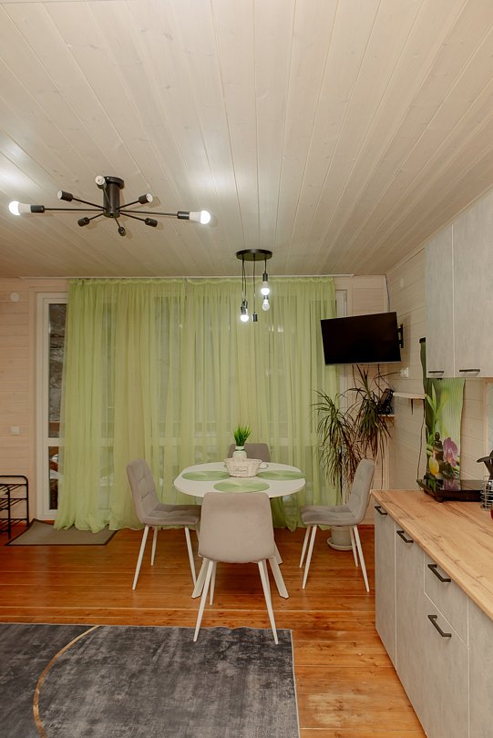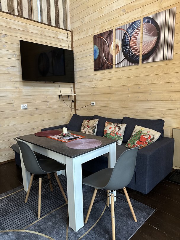 Внутри дома гостей ждет все необходимое для комфортного проживания. Просторная гостиная, объединенная со столовой, идеально подходит для дружеских встреч и семейных ужинов. Кухня с современными удобствами и мангалом приглашает вас готовить и делиться гастрономическими шедеврами в кругу семьи.