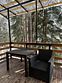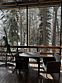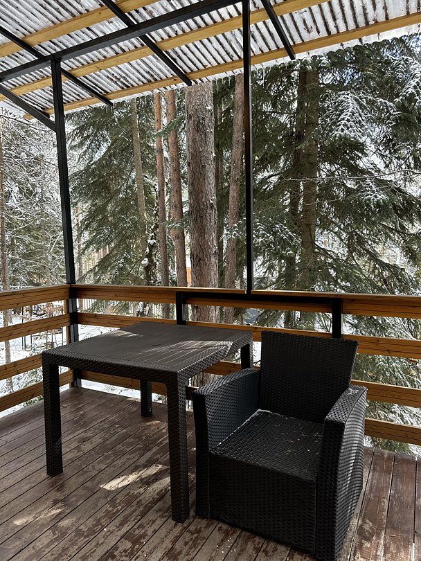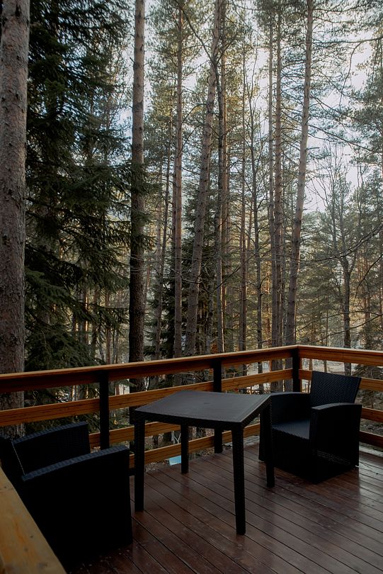 - Терраса с садовой мебелью и видом на хвойный лес и горы.
