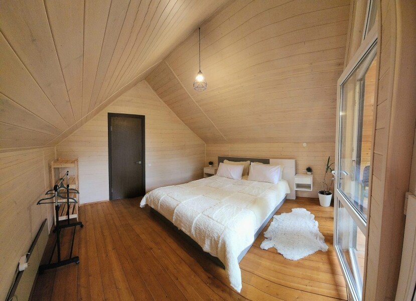 Спальные места: две отдельные спальни на втором этаже (одна с двуспальной кроватью, другая с двуспальным диваном), односпальный диван на первом этаже в кухне-гостиной.