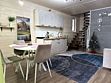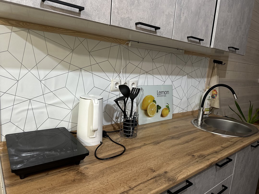 - Кухонный гарнитур, стол, стулья, чайник, варочная панель, телевизор, холодильник, микроволновая печь, диван.