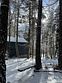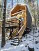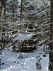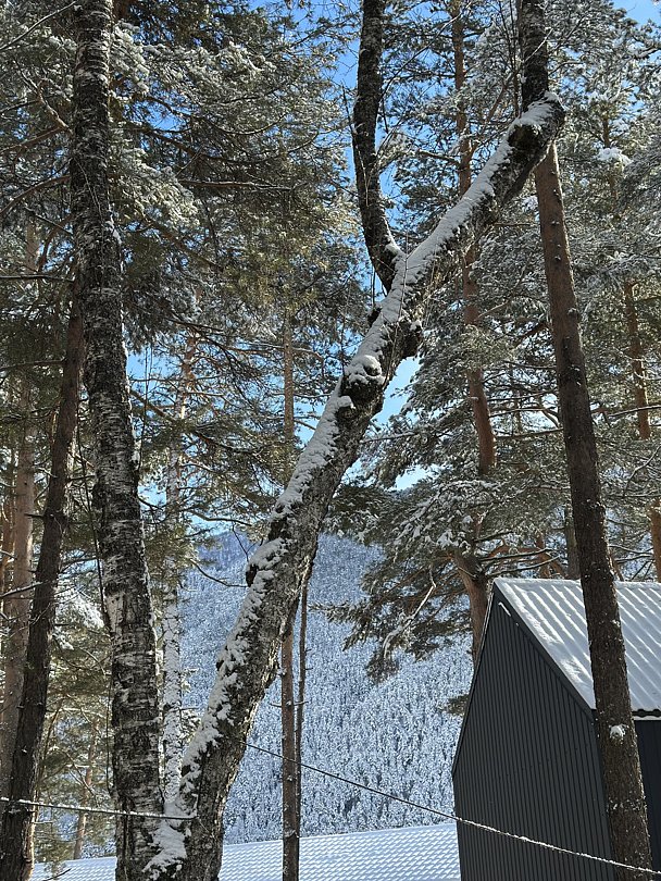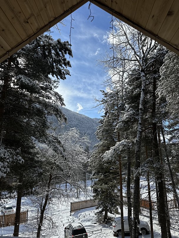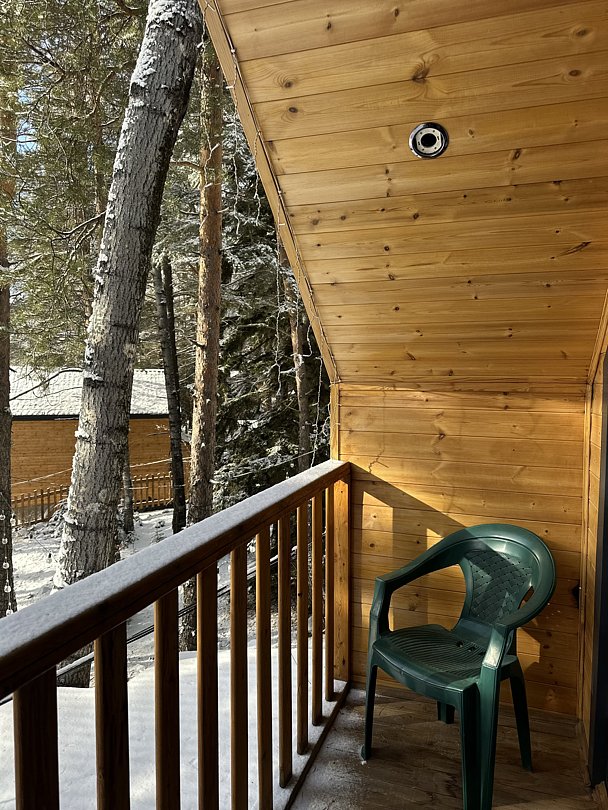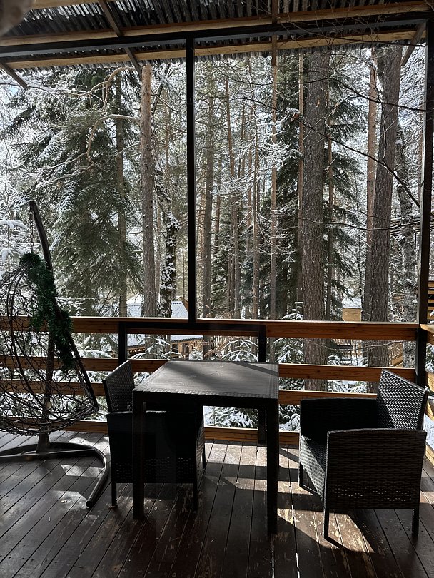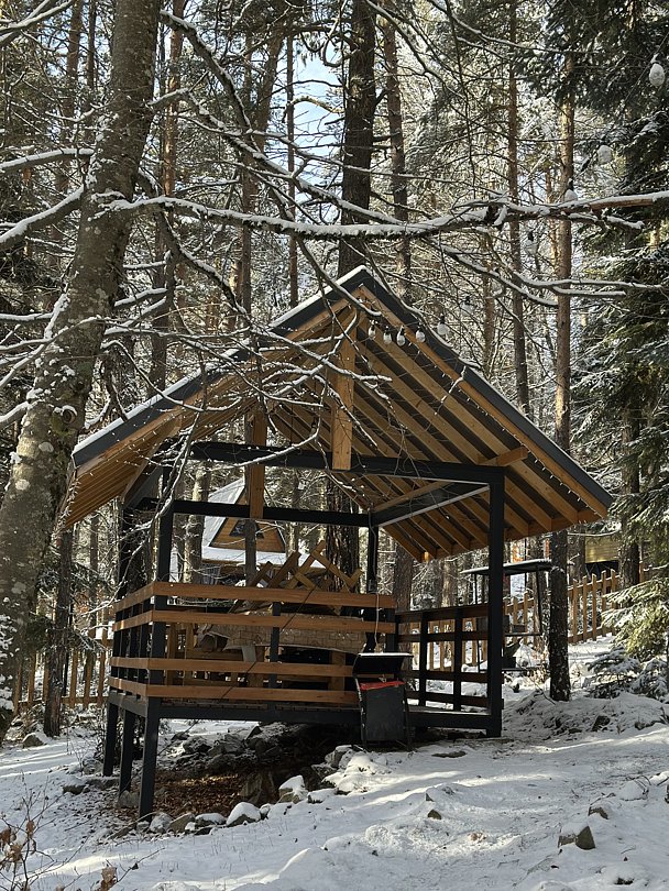 База отдыха "Дух Леса" в с. Архыз в хвойном лесу с видом на горы.