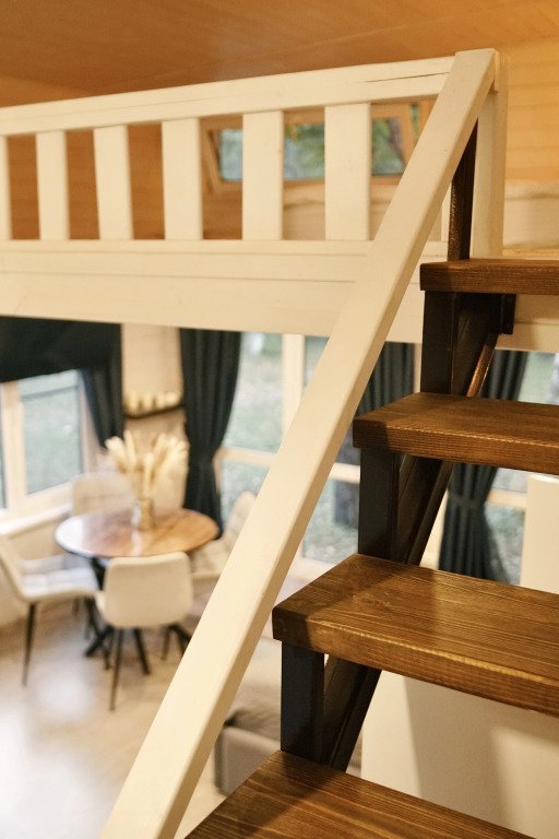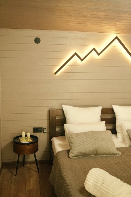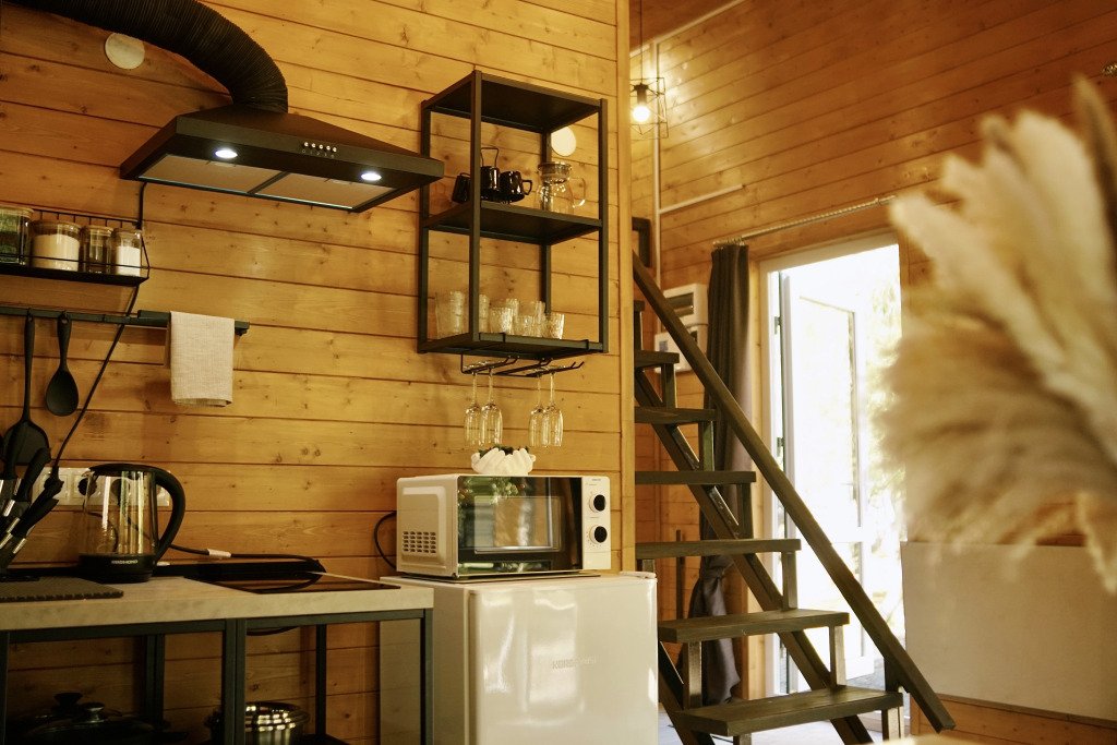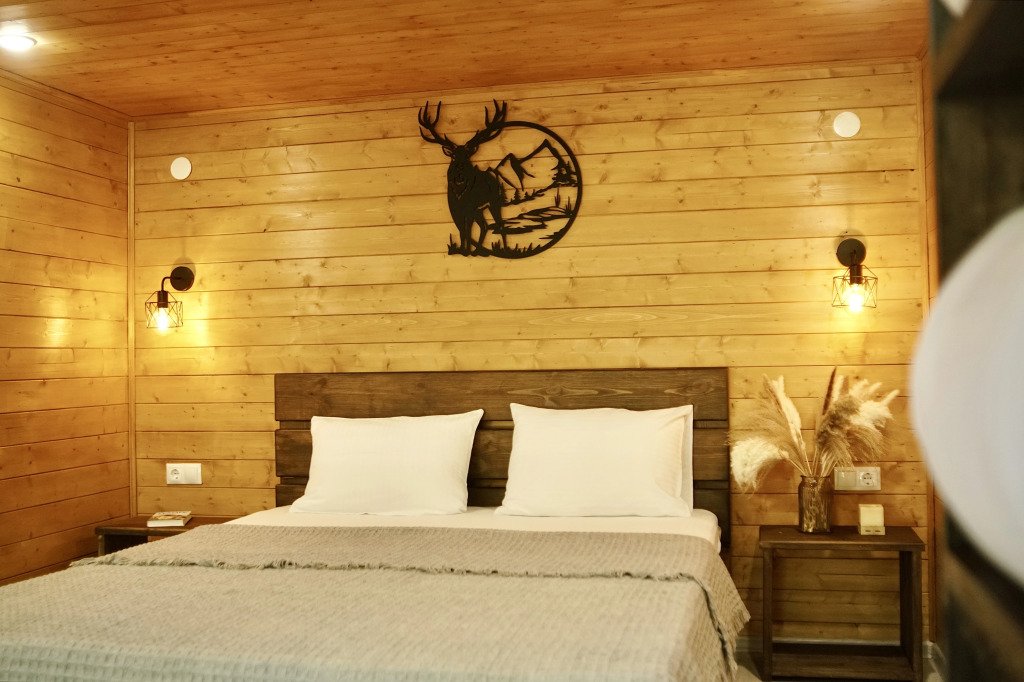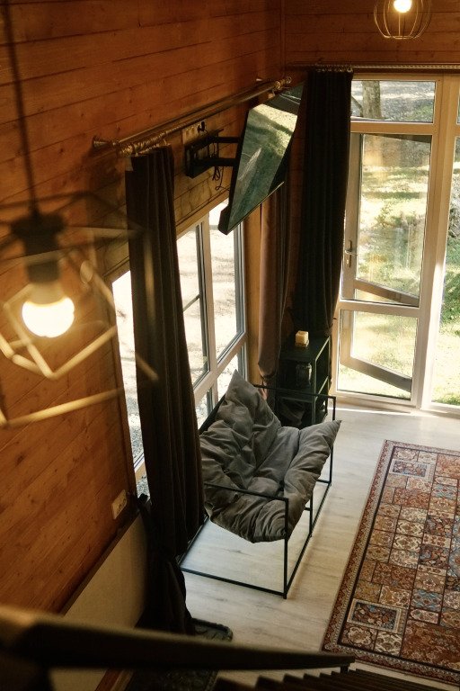Шале в глэмпинге рассчитаны на пребывание до 4-х гостей. Имеются двуспальная кровать и двуспальный матрас на втором свете, в связи с низким потолком. Предоставляется необходимая посуда и предметы гигиены, мебель с ортопедическим матрасом и спальными принадлежностями, постельное бельё. Также к услугам гостей есть персональная мангальная зона с принадлежностями для барбекю у каждого шале, чистая ледниковая вода прямо из-под крана.