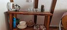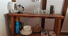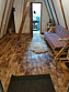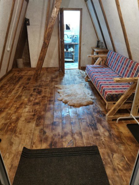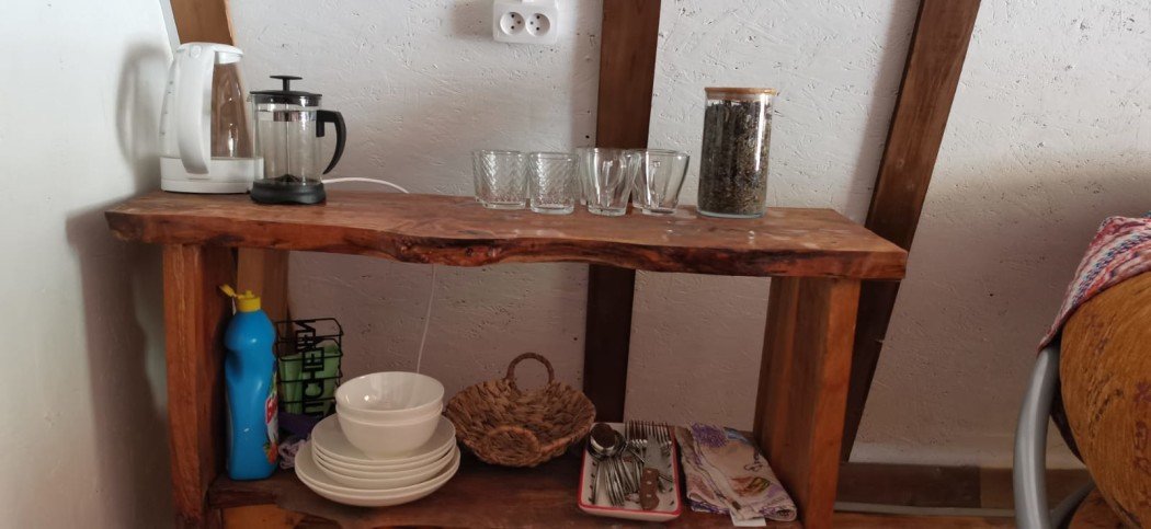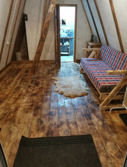 Две двуспальные кровати друг напротив друга на верху, внизу диван. Холодильник, посуда, чайник, телевизор, WI-FI.