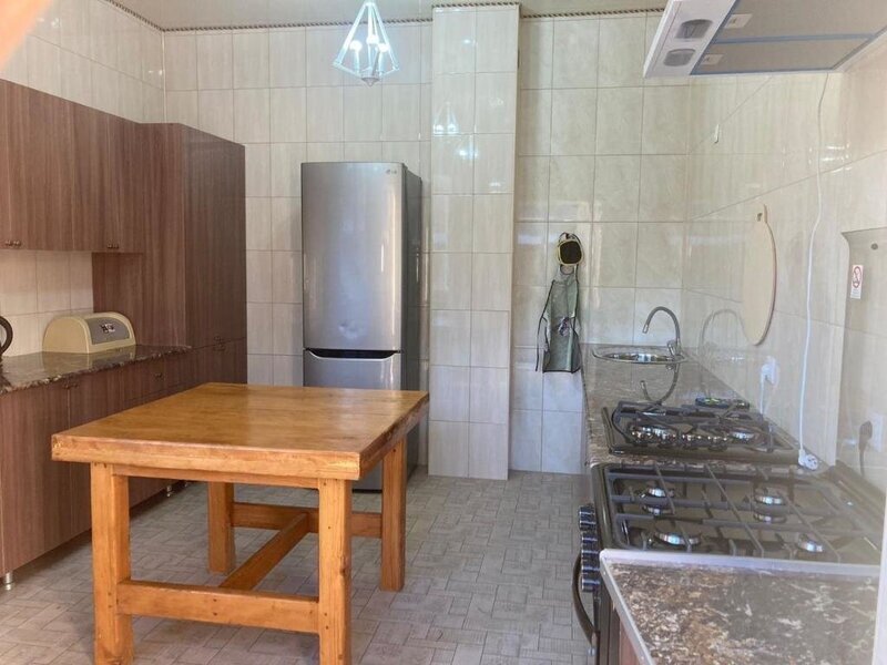 Общая кухня с обеденной зоной оборудована необходимой мебелью и бытовыми приборами, во дворе есть мангал. Поблизости большое число кафе.