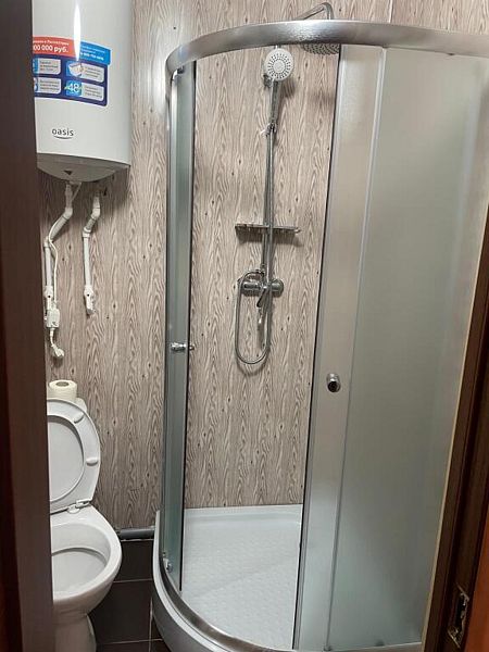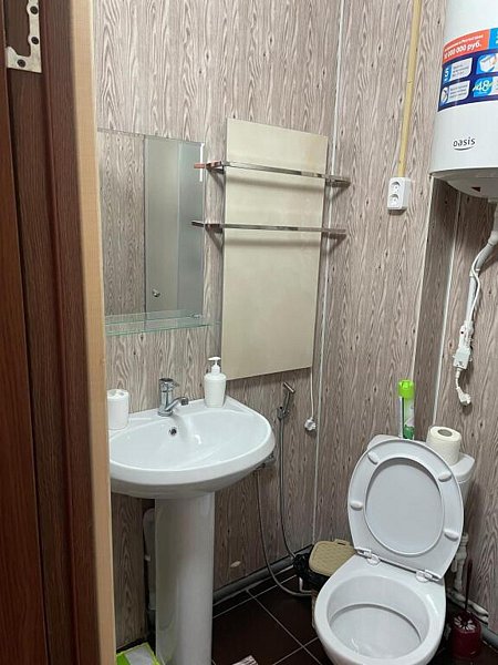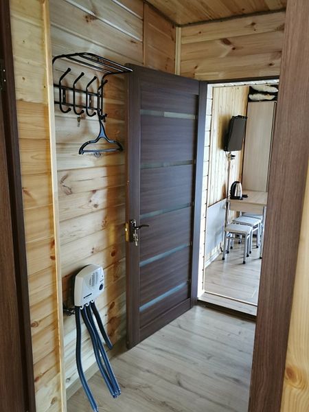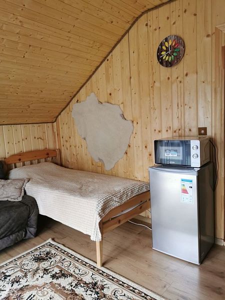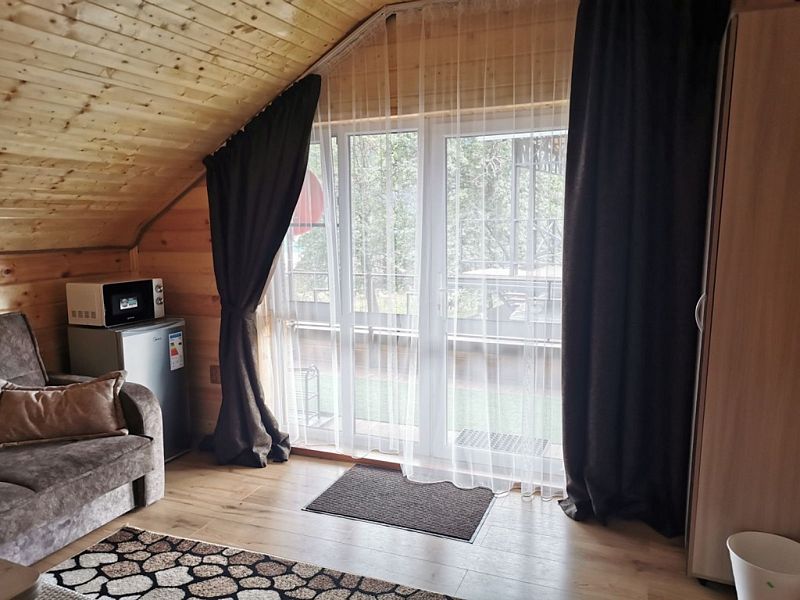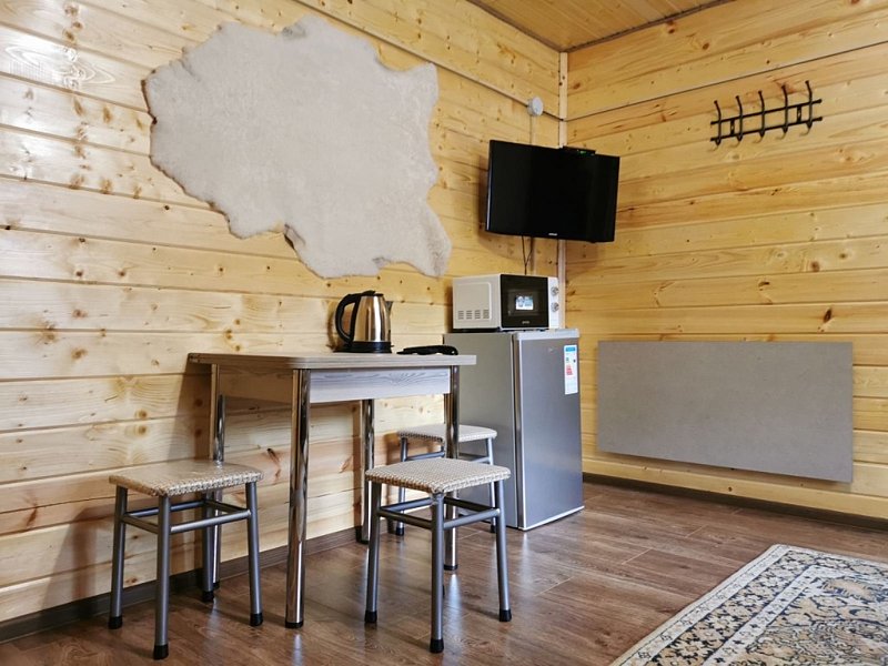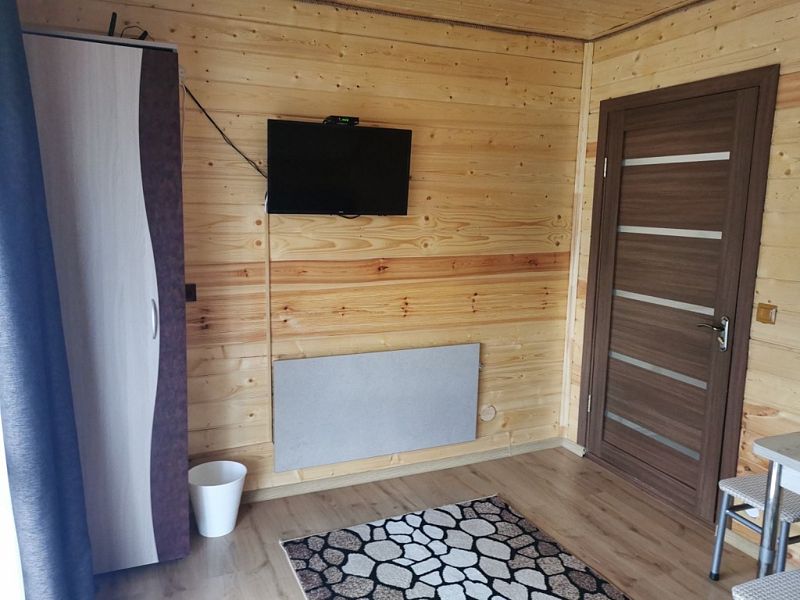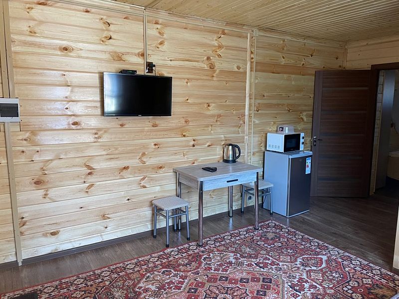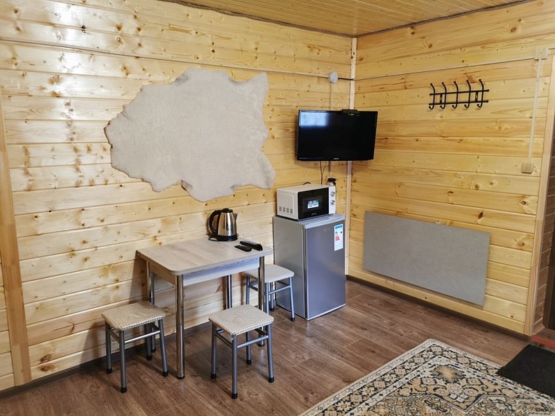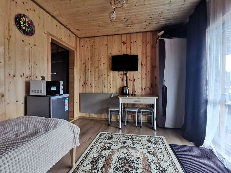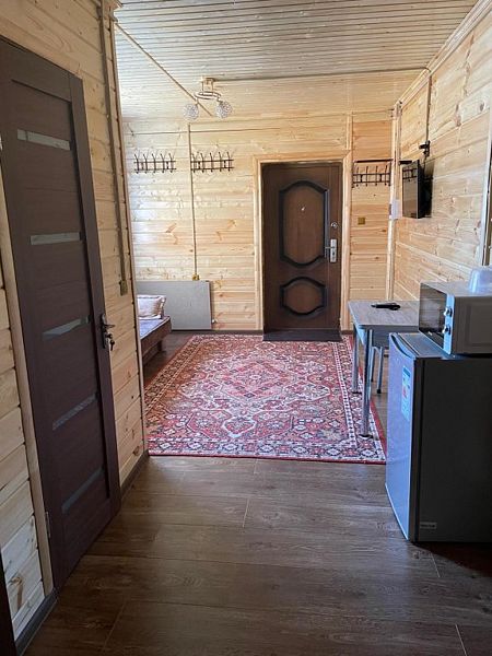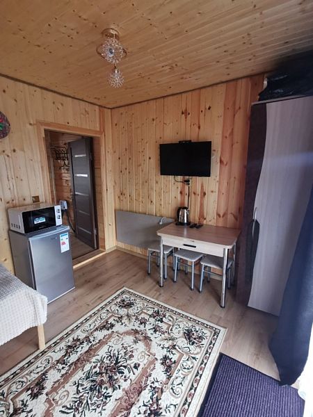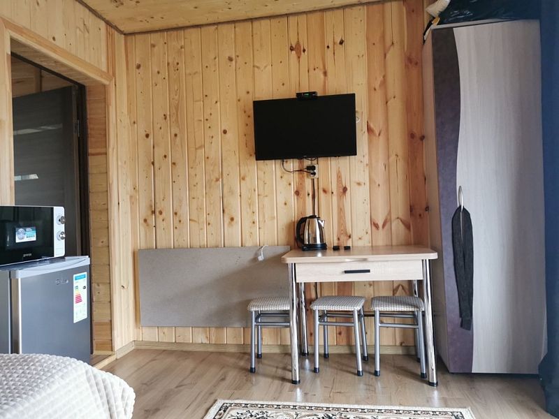 Среди удобств: микроволновка, чайник, холодильник и шкаф для одежды.