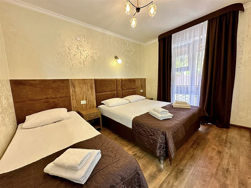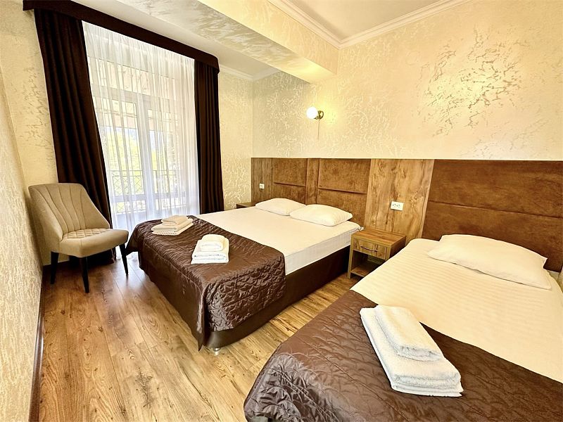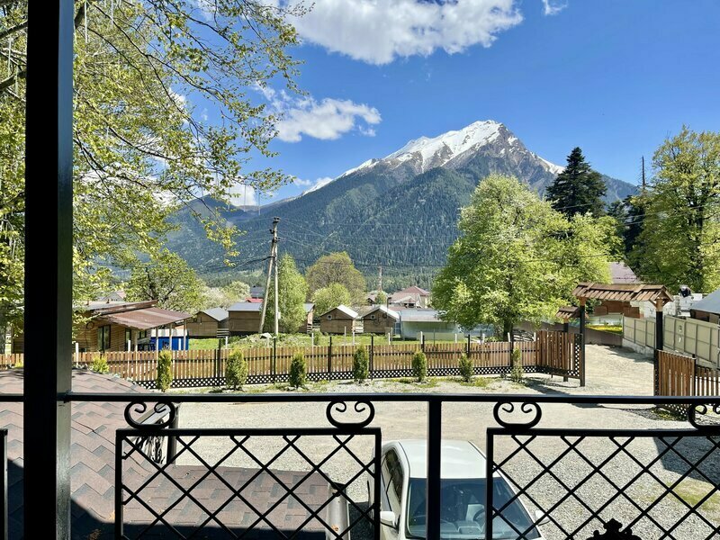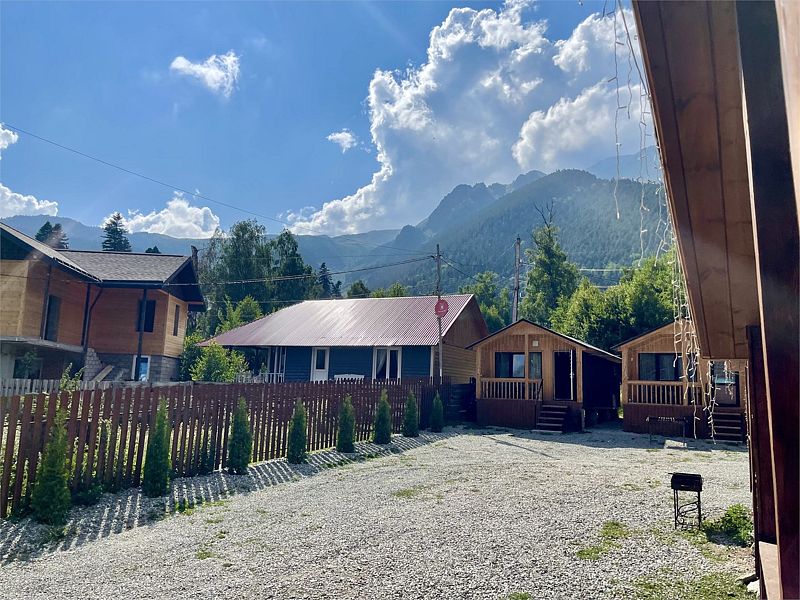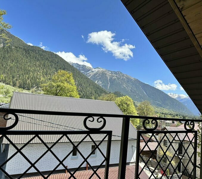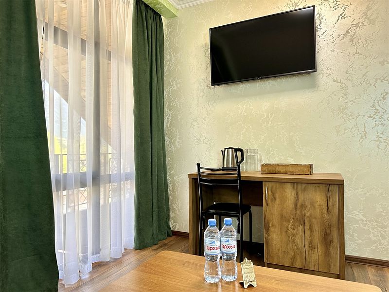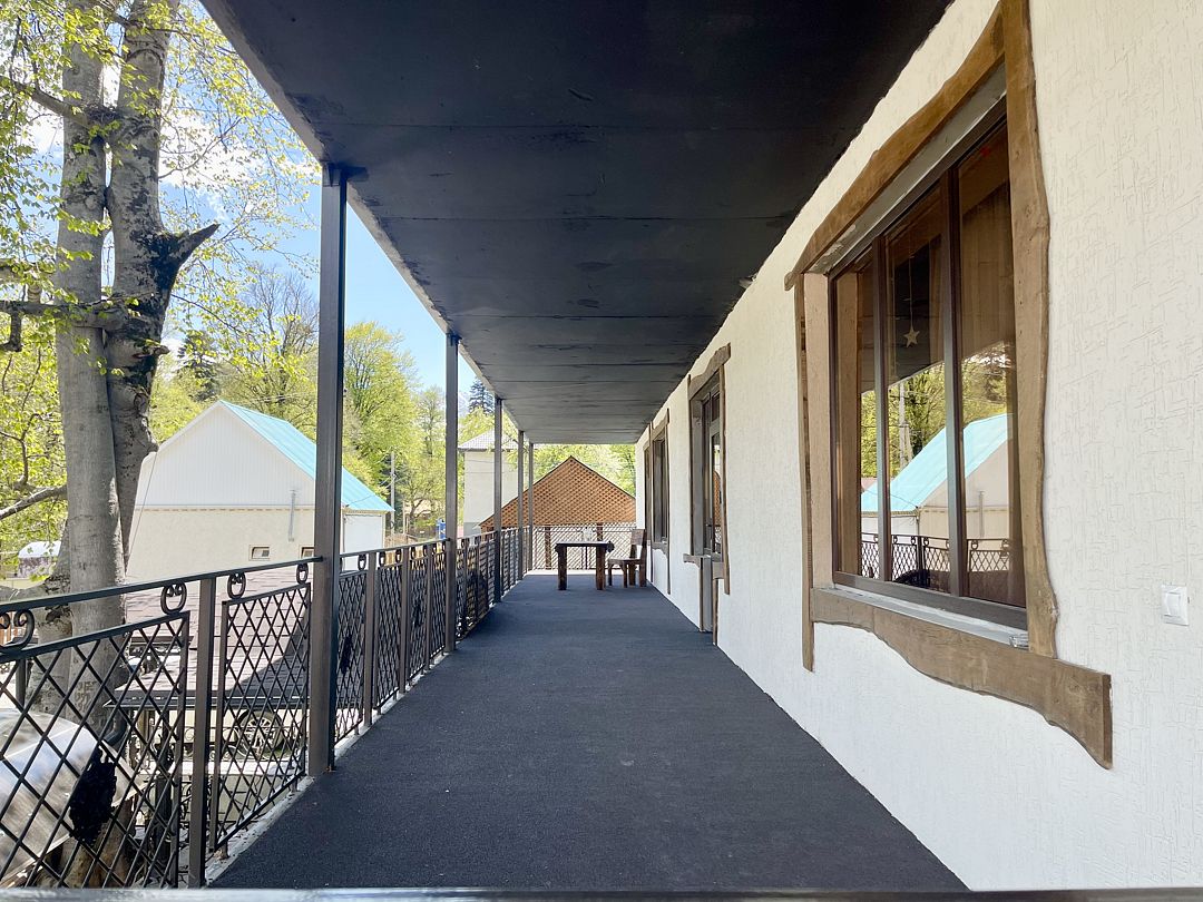 Семейный отдыхДостоинстваОтель оставил приятное впечатление. Номера чистые, с удобными кроватями, в комплекте вода, чай, одноразовые принадлежности для душа, тапочки и полотенца – все, что нужно для комфортного проживания. На территории есть качели с живописным видом на гору и просторный двор, где можно спокойно припарковать машину.