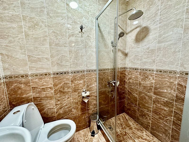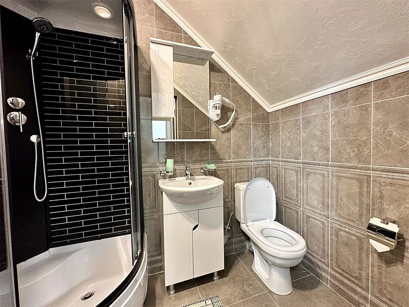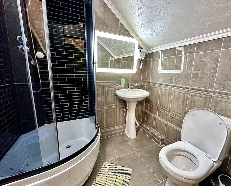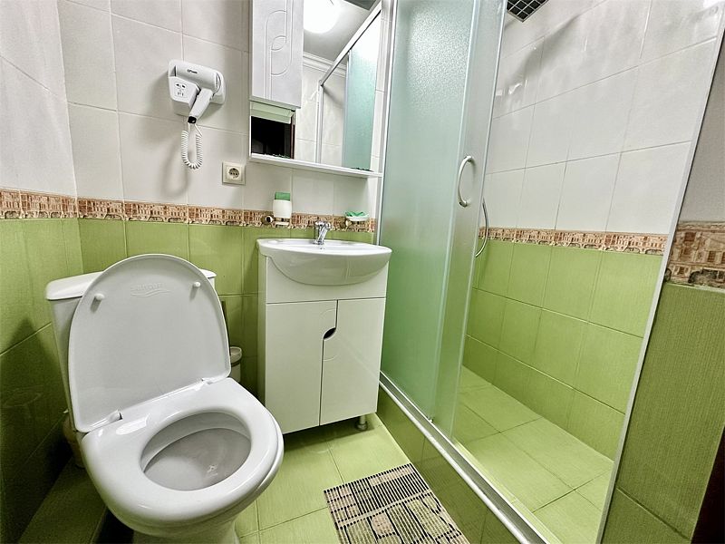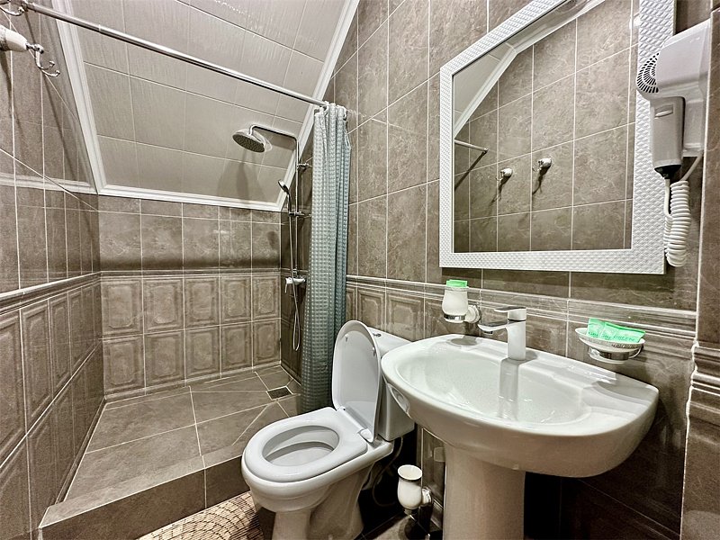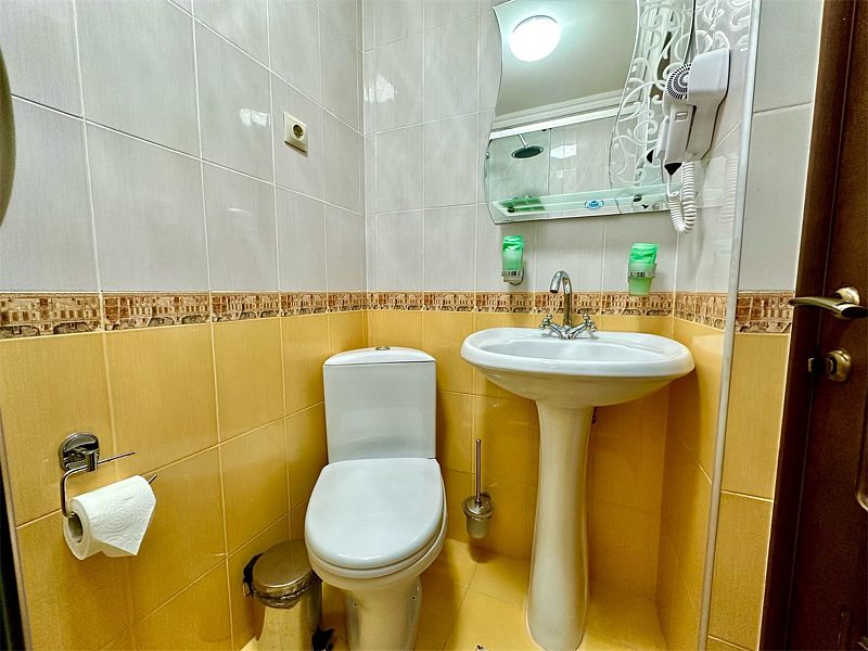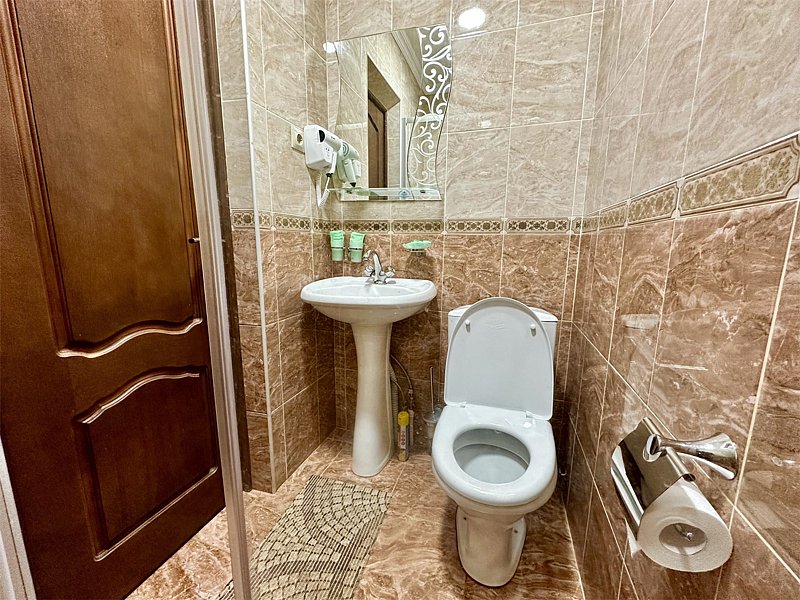 - собственная ванная комната с душем и туалетом, базовыми гигиеническими средствами, феном, полотенцами и тапочками.