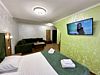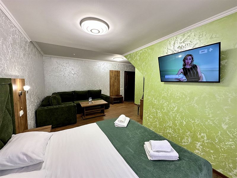 В номере — спальня с 1 двуспальной кроватью и гостиная с диваном. Есть телевизор, чайник, мини-холодильник, фен, чай/кофе, бутилированная вода, в номере есть собственная ванная комната с душевой кабиной, базовыми косметическими средствами, полотенцами и тапочками.
