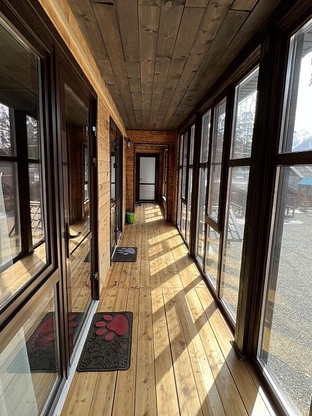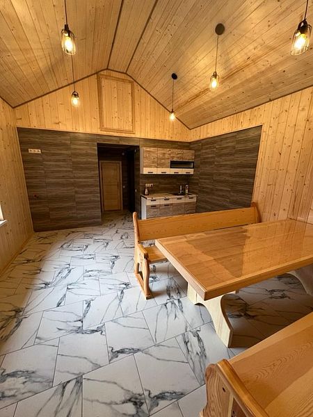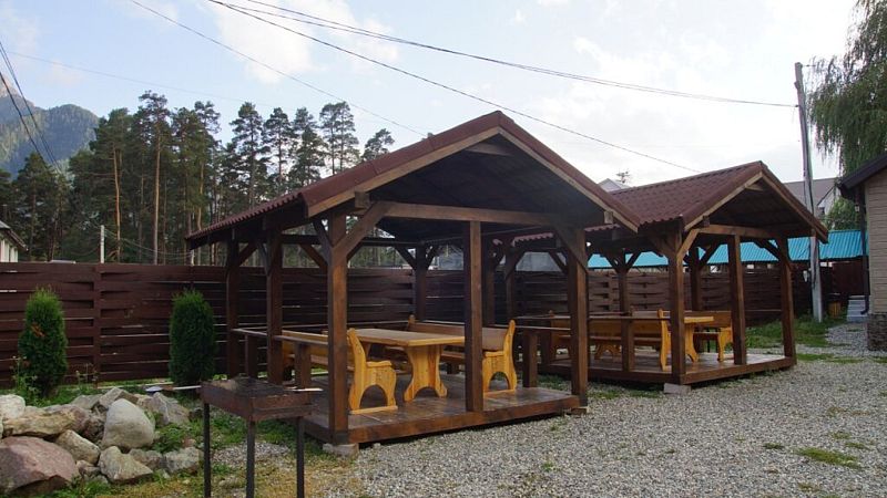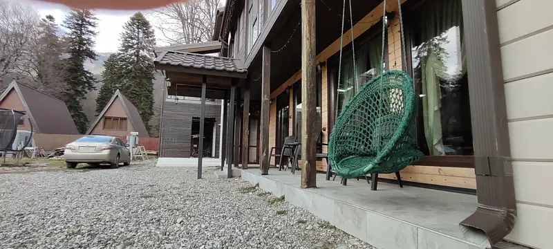 К услугам гостей — полностью оборудованная общая кухня с камином и всей необходимой посудой для самостоятельного приготовления пищи. Для автомобилистов предусмотрена бесплатная парковка на территории, а также удобная комната для хранения спортивного инвентаря и сушилка для одежды. Развлечения для всей семьи: детская площадка, батут и зона для барбекю. А для полного расслабления — русская баня, сибирский чан, уютные беседки, мангалы и казаны.