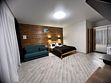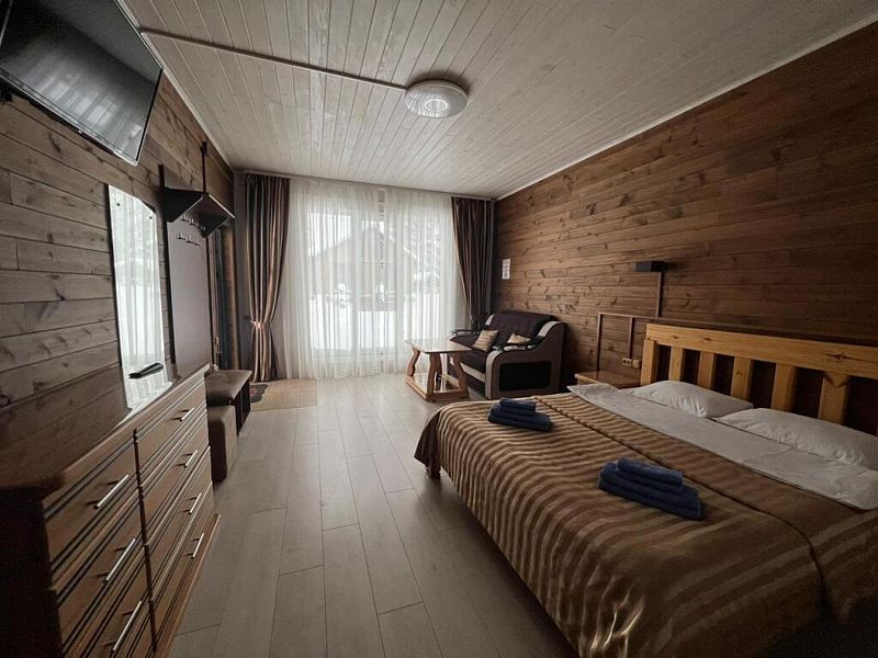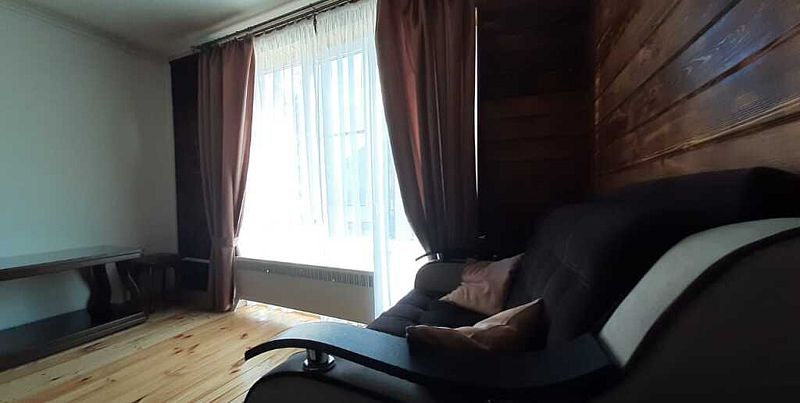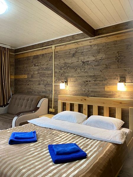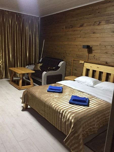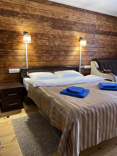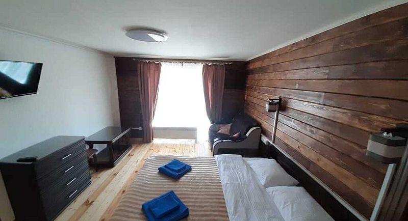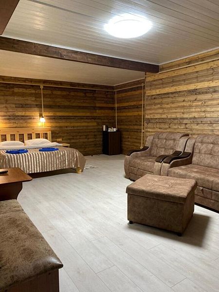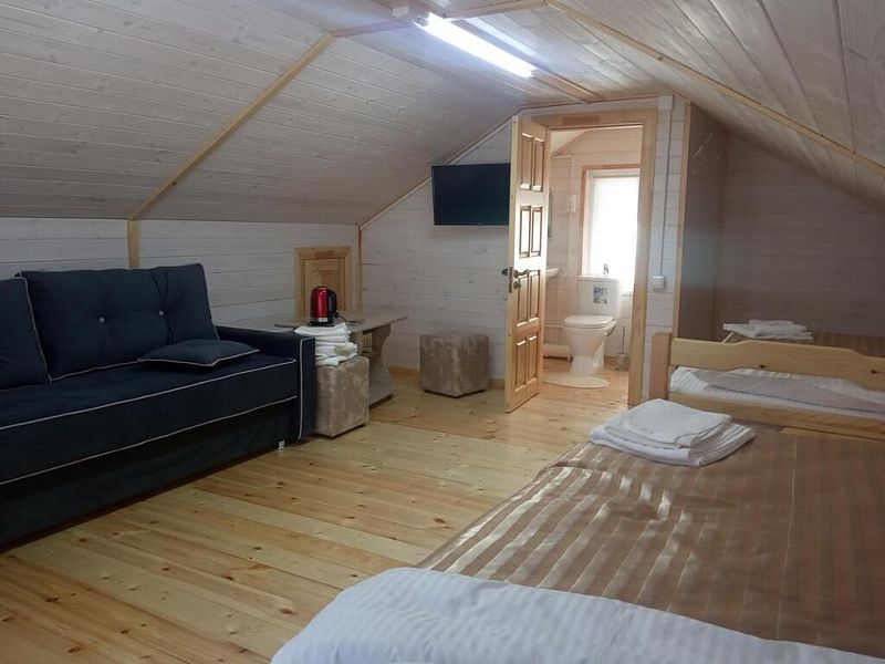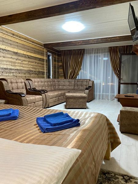 Совмещенный санузел с душем, фен, полотенца, водонагреватель. В номере кровать, ортопедический матрас, мягкая мебель, большой угловой диван, кресло, ТВ, мини-холодильник, Wi-Fi, питьевая вода. Вешалки с обувницей.