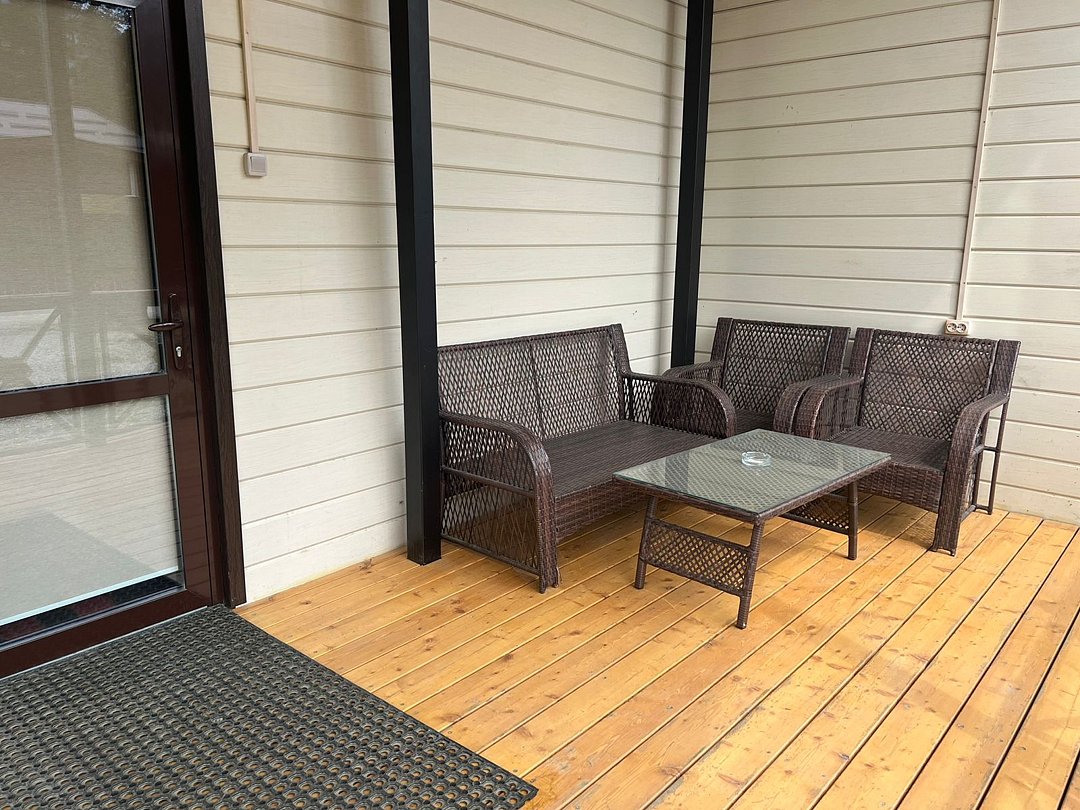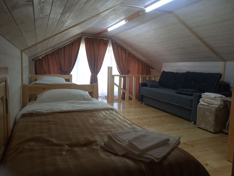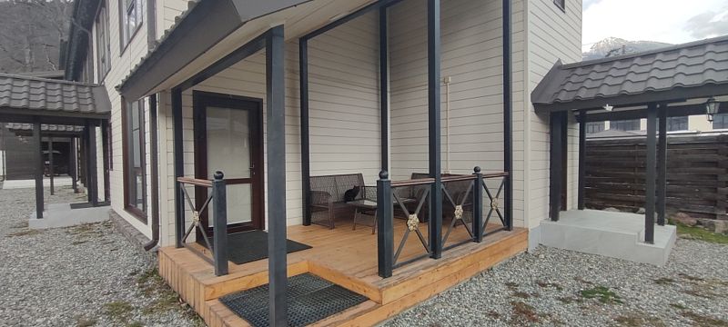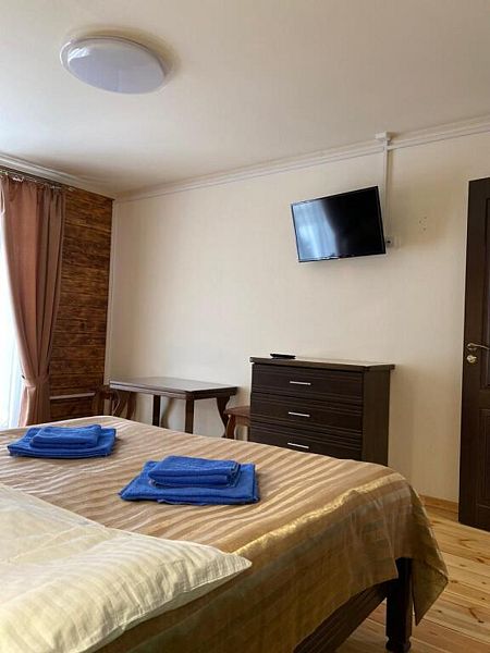 Совмещенный санузел с душем, фен, полотенца, водонагреватель. В номере кровать, ортопедический матрас, мягкая мебель, диван, еврораскладушка, ТВ, мини-холодильник, Wi-Fi, питьевая вода. Вешалки с обувницей. Веранда с ротанговой мебелью, стеклянным столиком и видом на горы.