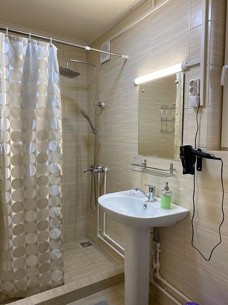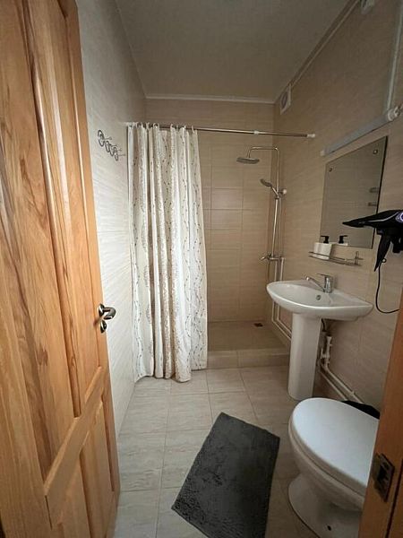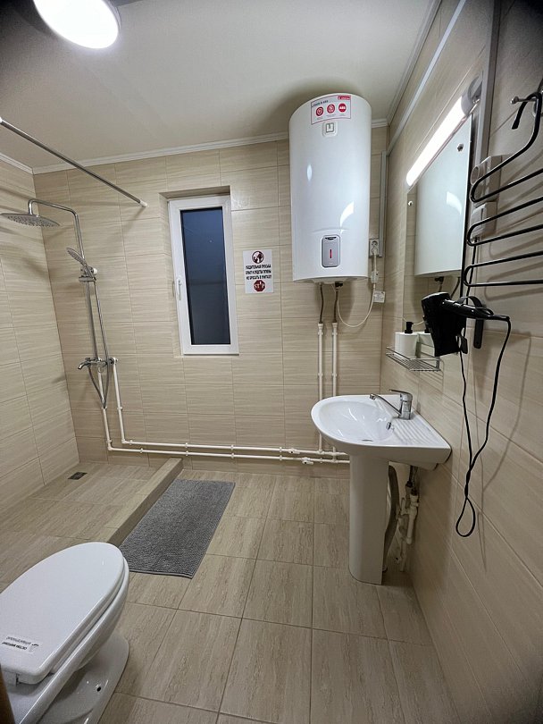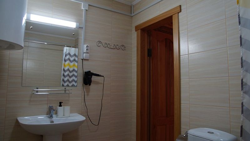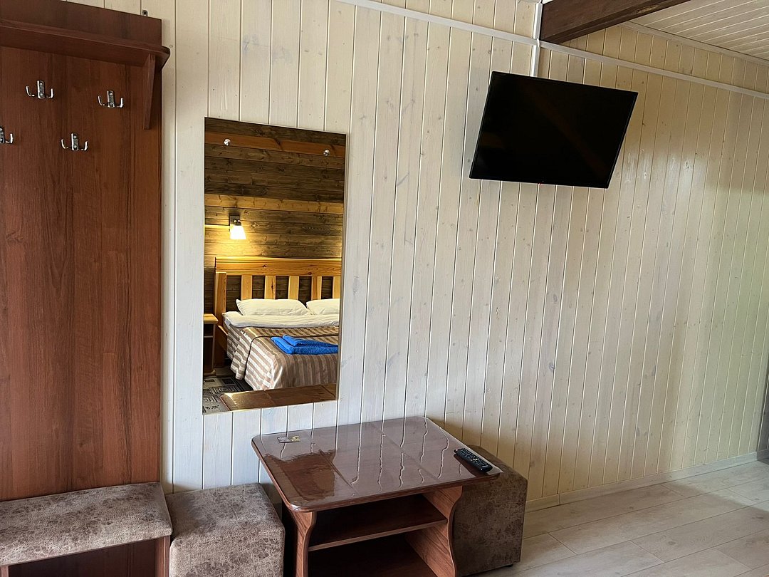 Совмещенный санузел с душем, фен, полотенца, водонагреватель. В номере кровать, ортопедический матрас, мягкая мебель, диван, ТВ, мини-холодильник, Wi-Fi, питьевая вода. Вешалки с обувницей.