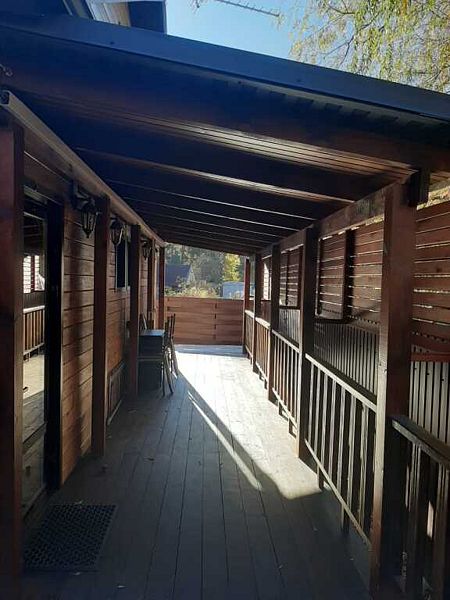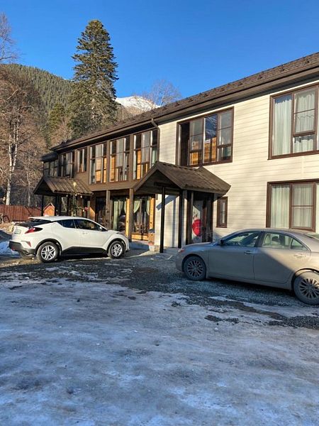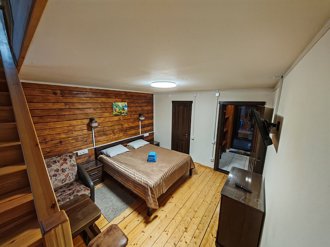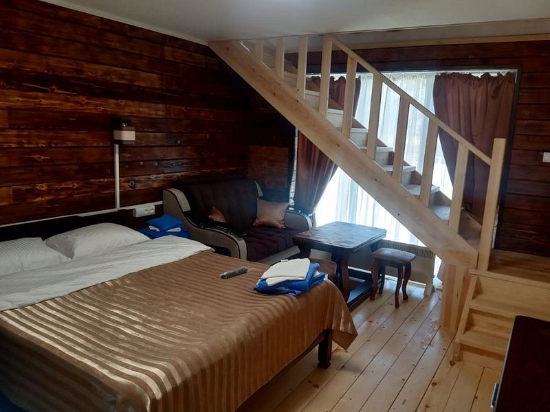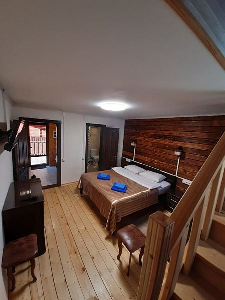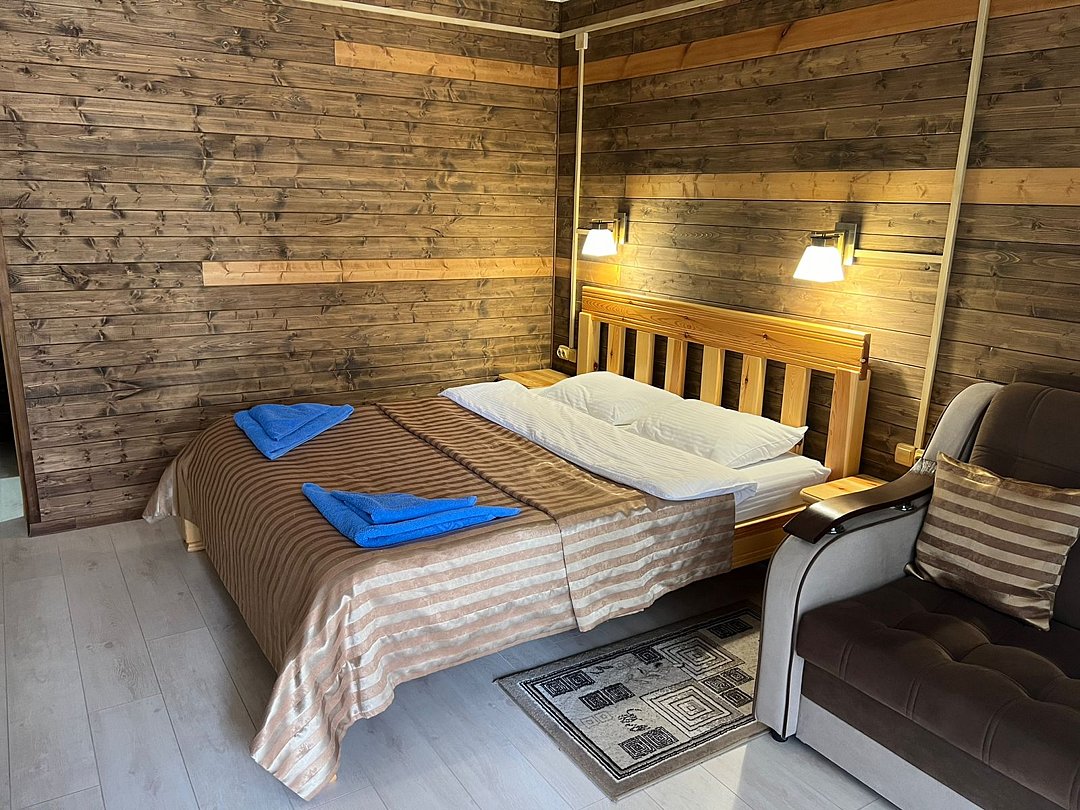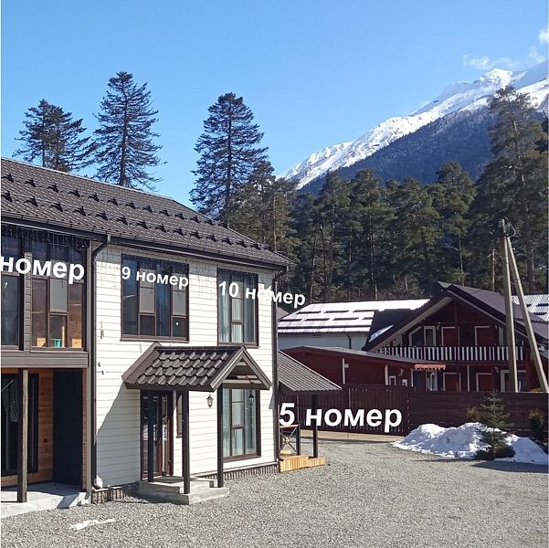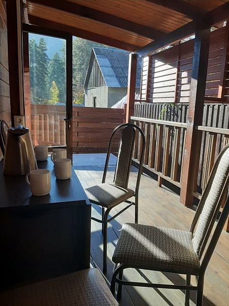 Совмещенный санузел с душем, фен, полотенца, сушилка для белья, водонагреватель. В номере кровать, ортопедический матрас, мягкая мебель, диван, ТВ, мини-холодильник, Wi-Fi, чайник, чашки, питьевая вода. Терраса с обеденным столиком, рядом ручей, прекрасный вид на горы.