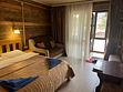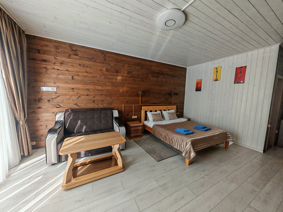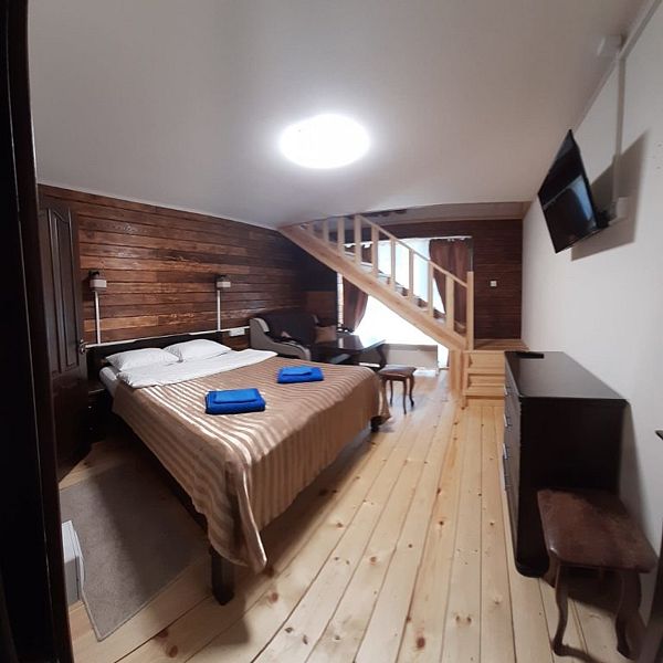 Совмещенный санузел с душем, фен, полотенца, водонагреватель. В номере кровать, ортопедический матрас, мягкая мебель, диван, еврораскладушка, ТВ, мини-холодильник, Wi-Fi, питьевая вода. Вешалки с обувницей. Терраса с ротанговой мебелью, стеклянным столиком и видом на горы.
