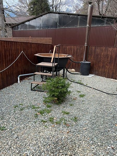 Сибирский чан с подогревом на дровах и удобным столиком для напитков.
