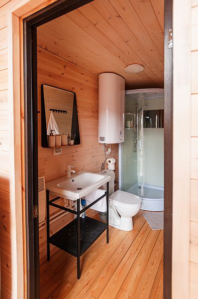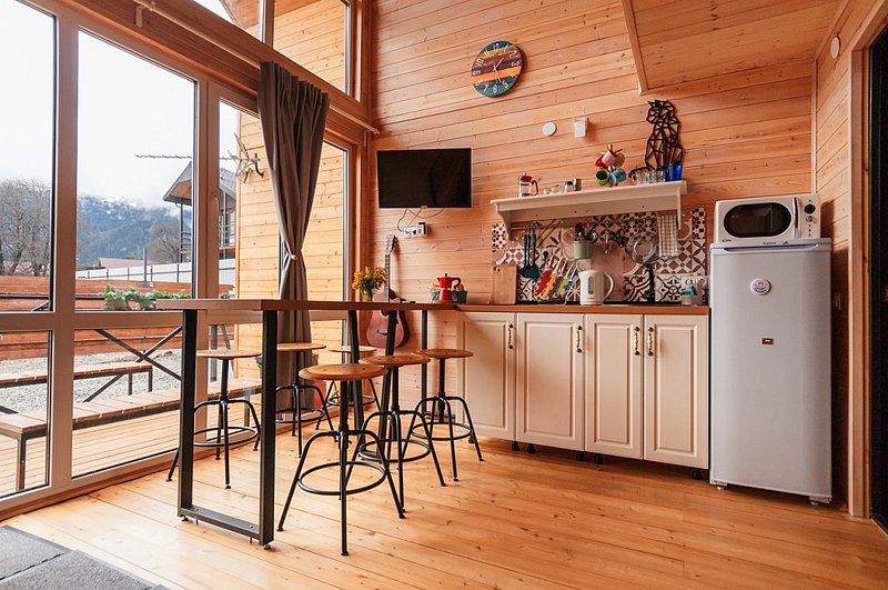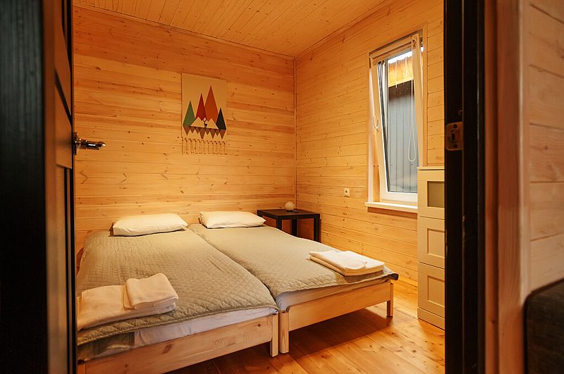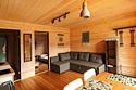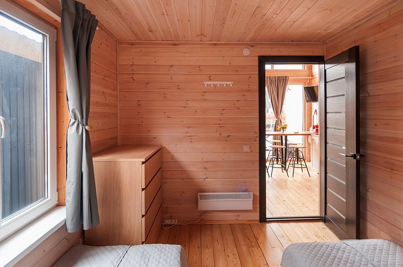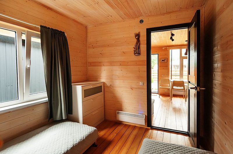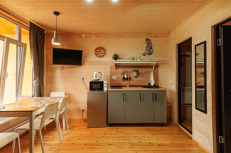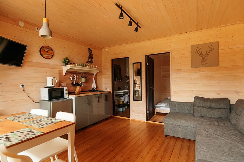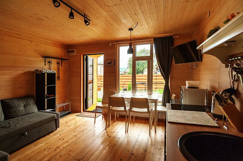 В домах площадью 38 кв.м имеется: спальня с двумя отдельными кроватями (при необходимости две кровати складываются в одно двуспальное место или в одну высокую кушетку),а также комод для личных вещей; полностью оборудованный санузел с душевой кабиной; гостевая комната с угловым раздвижным двухместным диваном и кухней. В домиках есть все кухонные принадлежности, постельное белье. На террасе дома есть мебель