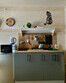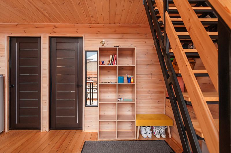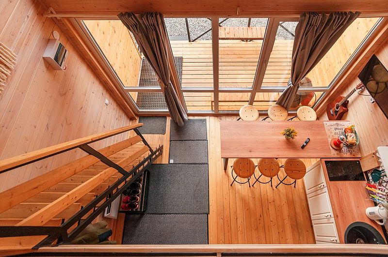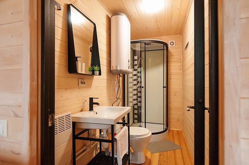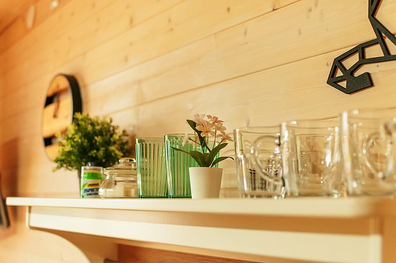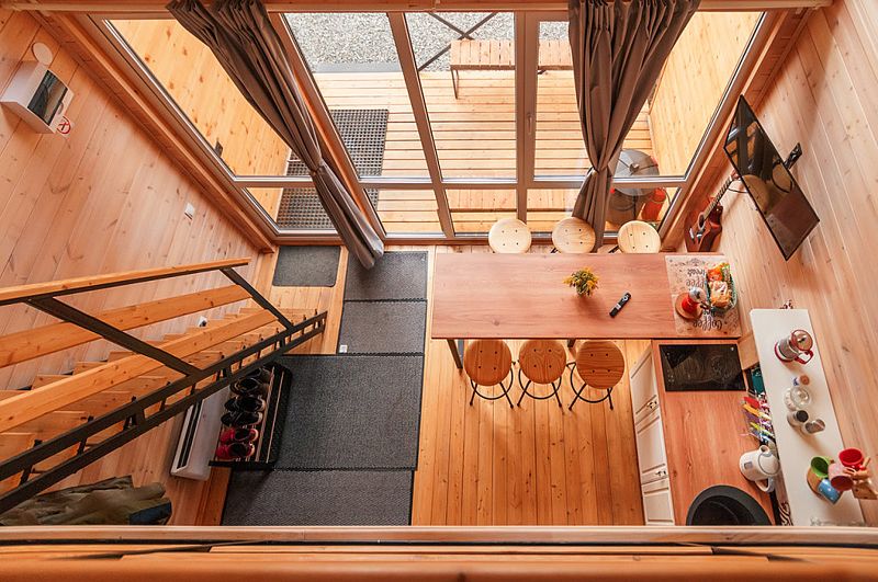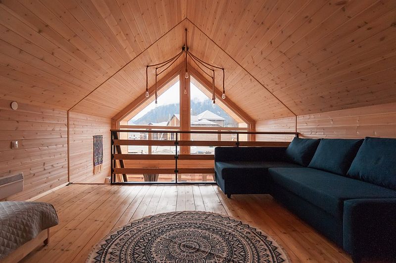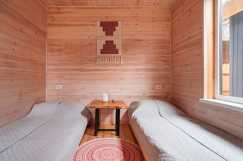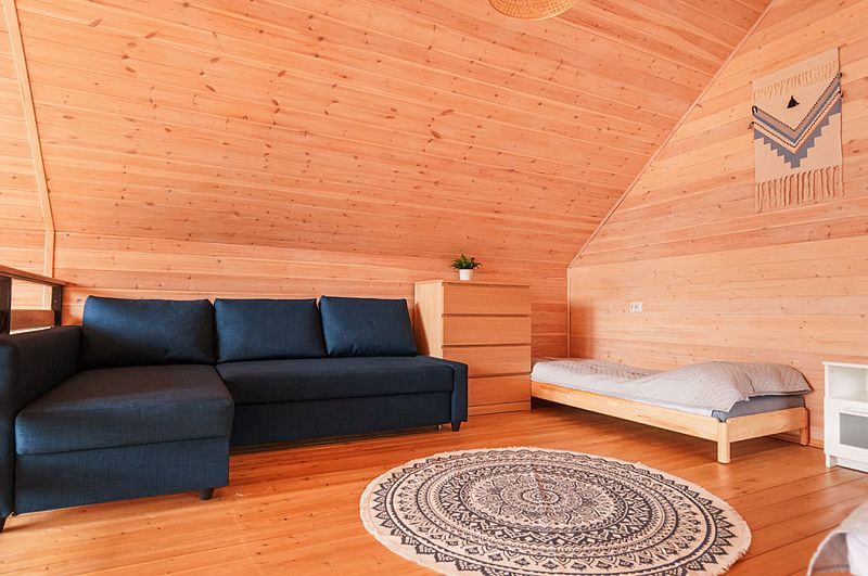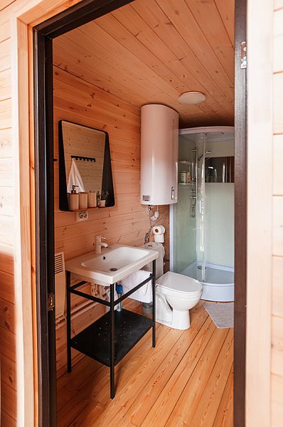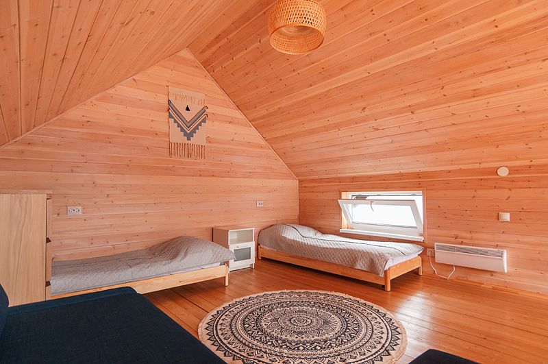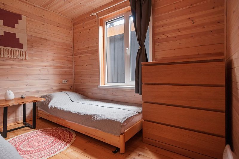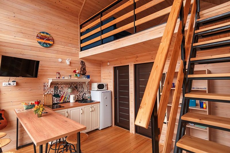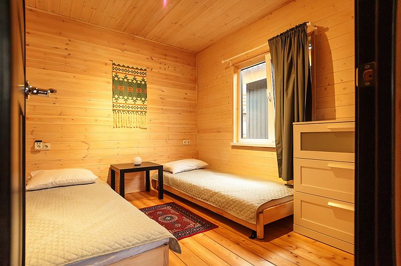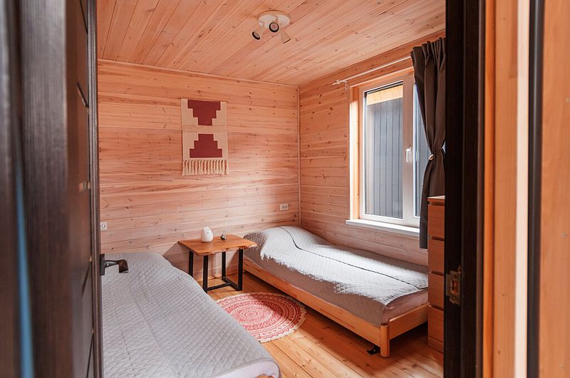 В Барнхаусе площадью 50 кв.м имеется: спальня с двумя отдельными кроватями (при необходимости две кровати складываются в одно двуспальное место или в одну высокую кушетку),а также комод для личных вещей; полностью оборудованный санузел с душевой кабиной; гостевая комната с кухней и прихожей. На втором этаже в стиле (лофт) по лестнице наверх расположены 2 одноместные кровати и угловой раздвижной двухместный диван. В домиках есть все кухонные принадлежности, постельное белье. На террасе дома есть мебель.