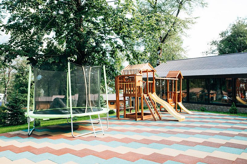 Гостям на автомобиле предоставляется удобная парковка. Для детей предусмотрена специально оборудованная игровая площадка с горкой, батутом и качелями, где они смогут весело провести время.