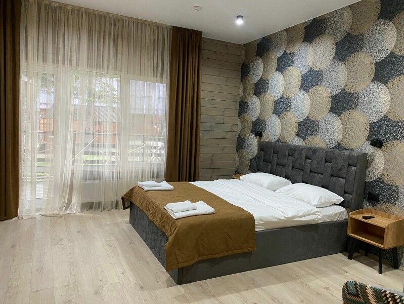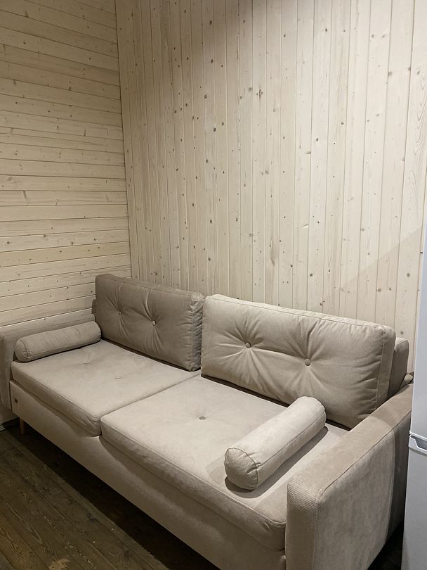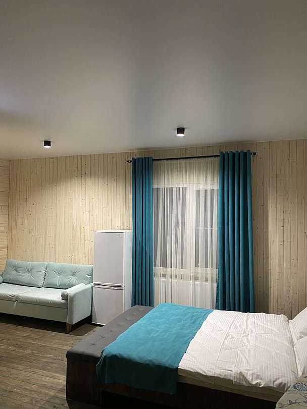 В доме расположена двуспальная кровать и доп. диван для двух человек.