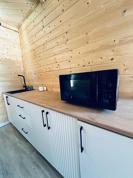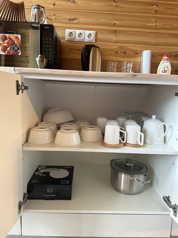 - Кухня-гостиная: кухонный гарнитур, холодильник, чайник, микроволновая печь, посуда, стол, стулья, шкаф, двуспальный диван, TV, Wi-Fi.