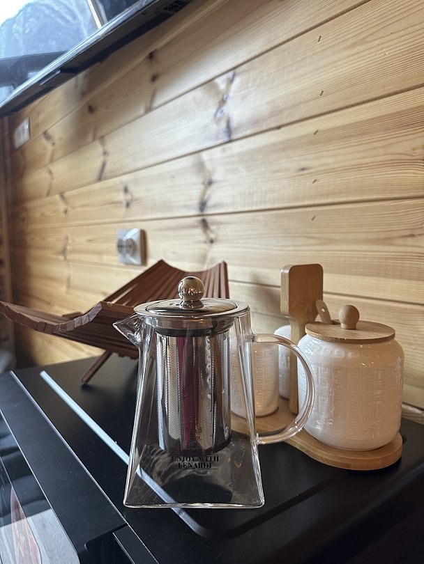 - Халат, тапочки, мини-набор (гель для душа, шампунь, зубная щётка).