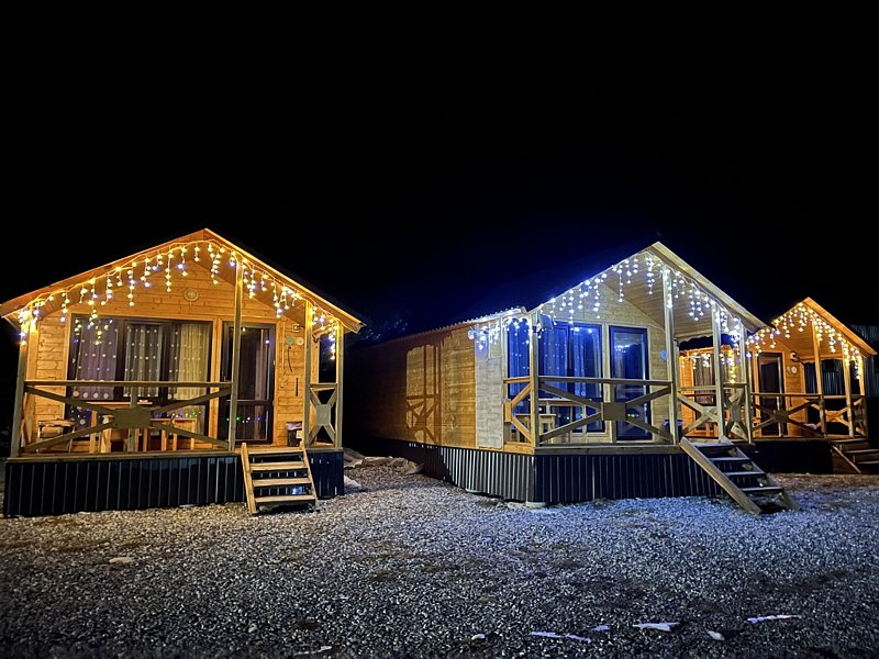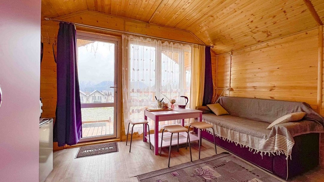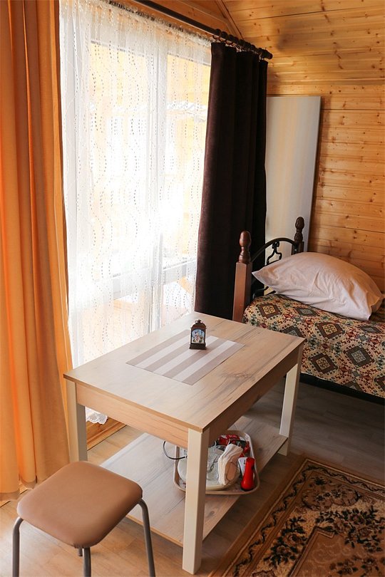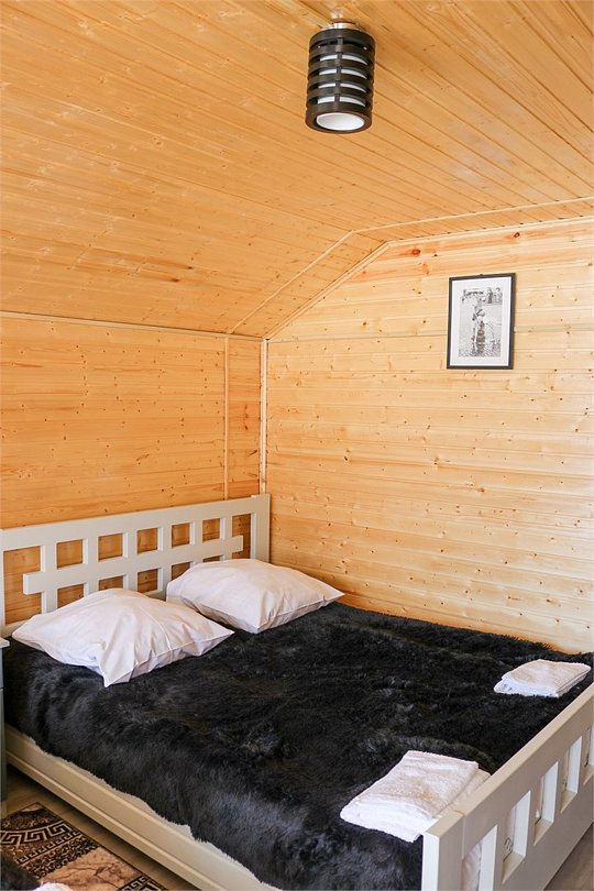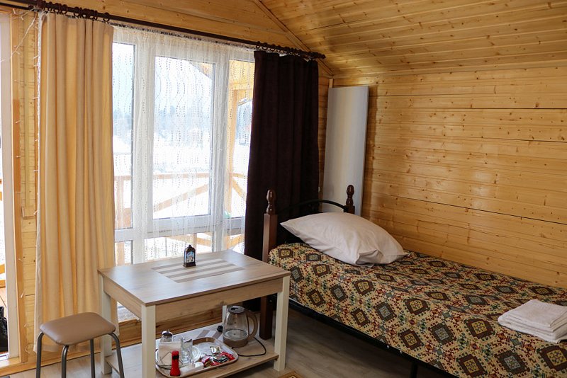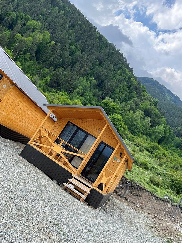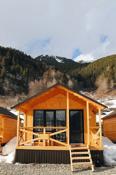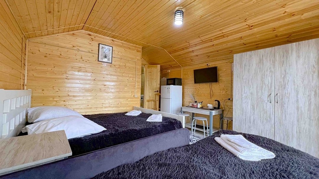 - комфортные условия: в каждом домике есть собственный санузел с душем, индивидуальная система обогрева, терраса с прекрасным видом на горы, а также вся необходимая бытовая техника — телевизор, электрочайник, фен, мини-холодильник, микроволновая печь;