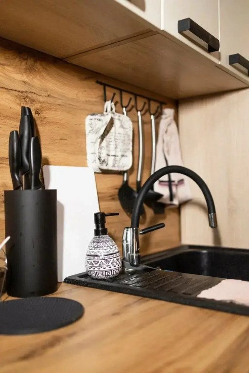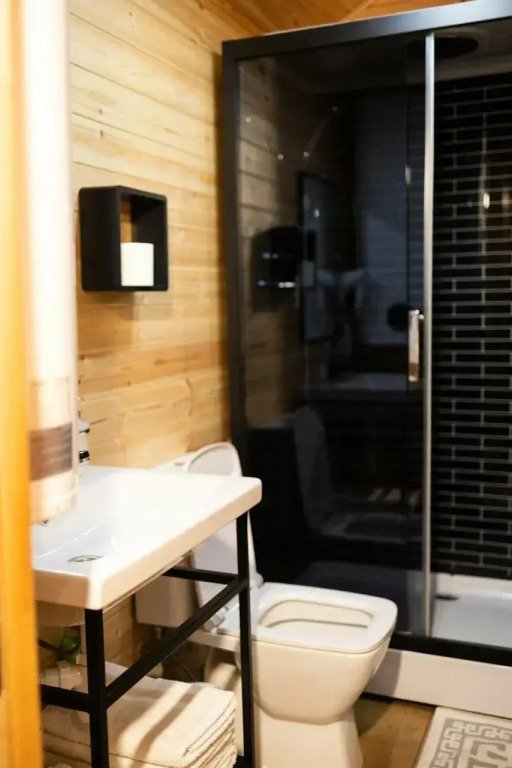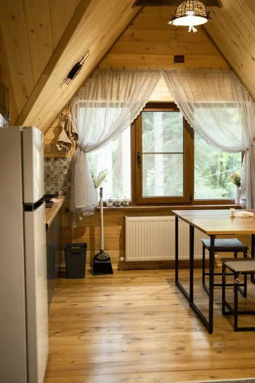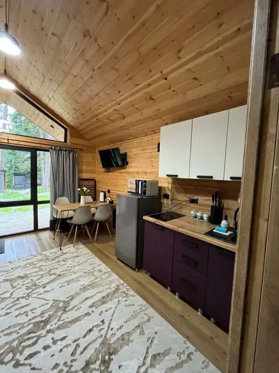 Номера категории «Апартаменты» и «Шале» оснащены кухонной зоной с плитой, микроволновой печью, чайником и посудой.