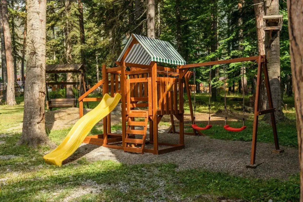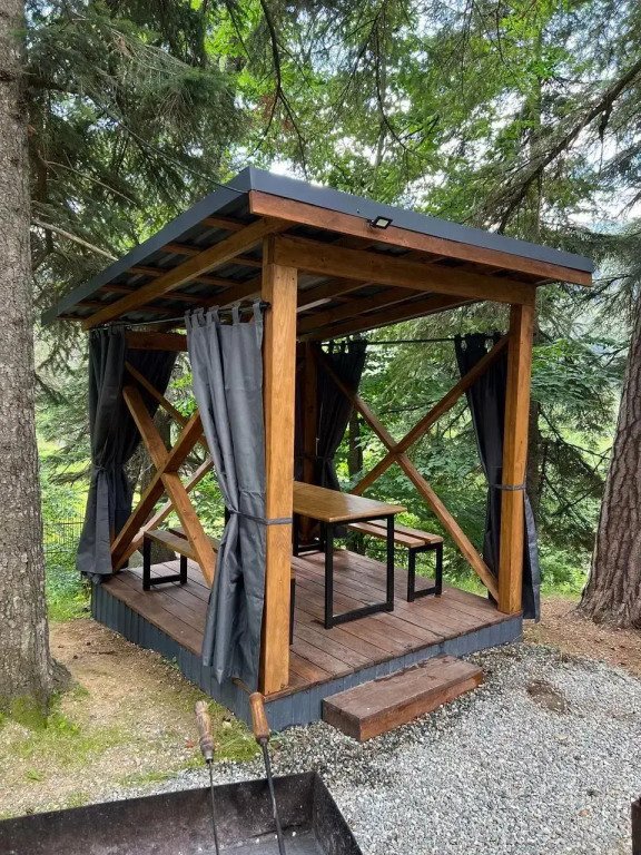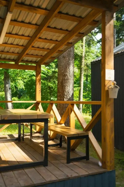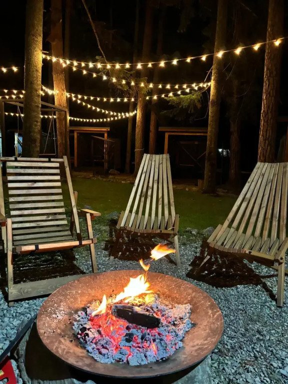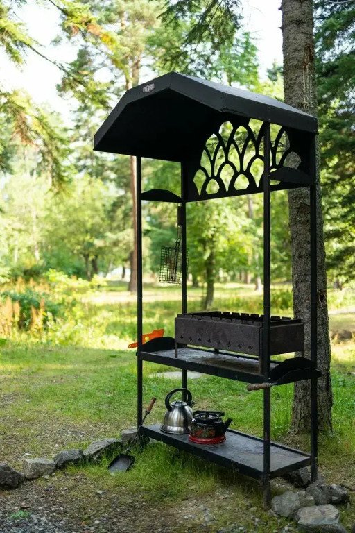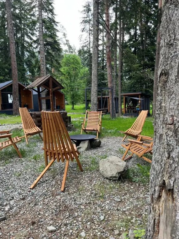 На территории общая кухня, мангальная зона, беседки и качели в стиле лофт, детская площадка, батут, гамак.