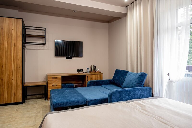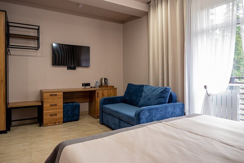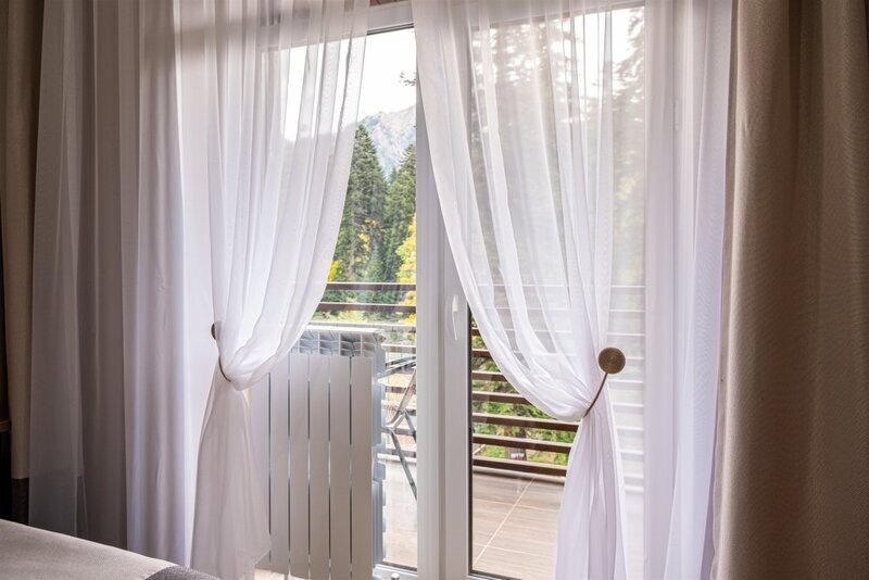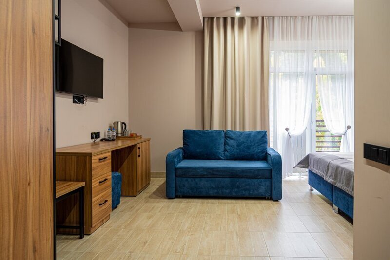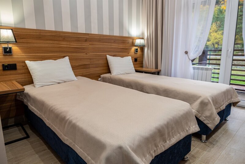Номера – чистые, светлые и уютные. В каждом номере есть все необходимое для комфортного отдыха: холодильник, чайный набор и электрический чайник, телевизор, шкаф для одежды, письменный стол, бра рядом с кроватью, которые удобно использовать для чтения, зеркало, а также большие террасы со столиком и стульями в каждом номере. Только представьте, каково это – провожать закат, сидя на террасе и слушая шум горной реки!