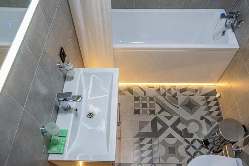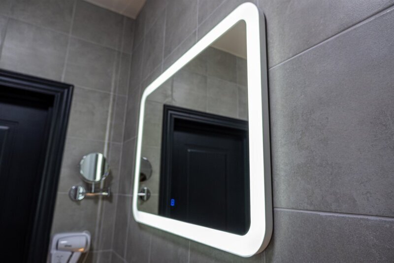В санузле номеров категории «Полулюкс» вас ждёт шикарная ванна, светодиодная подсветка, белоснежные полотенца, набор качественных уходовых средств, а также зеркало с подсветкой, благодаря которой очень удобно краситься или бриться (увеличительное зеркало также имеется).