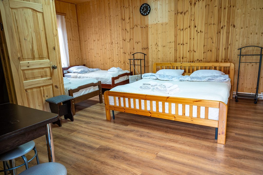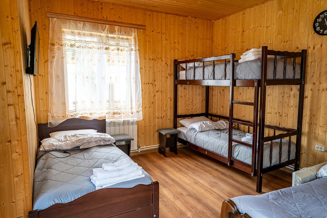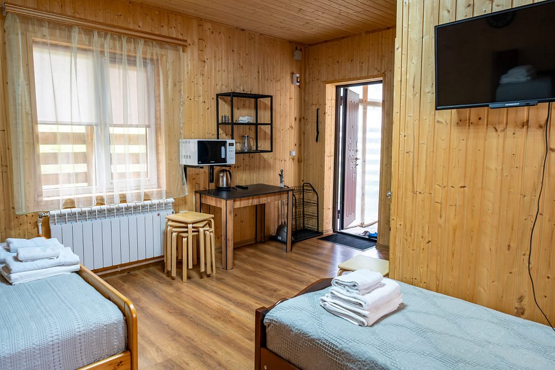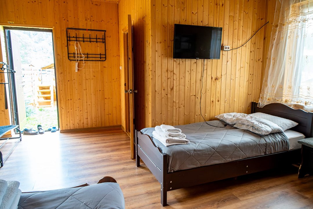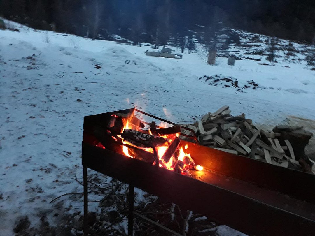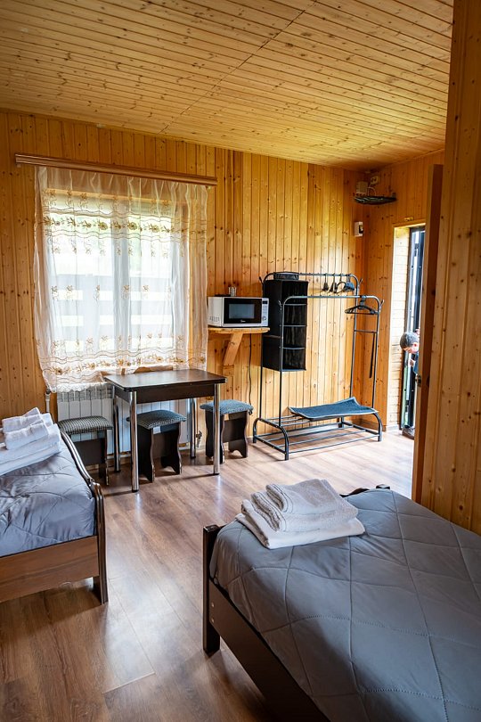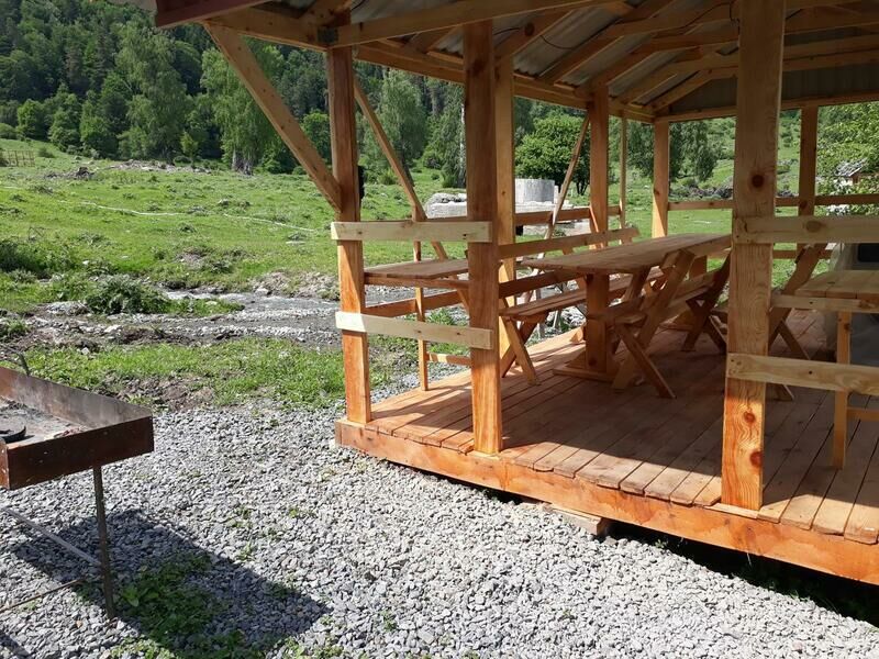 Отличное местоположение обещает шикарный вид из окон номеров и множество возможностей активного отдыха. Большая территория для парковки и игр с детьми, три беседки с мангалами, также по территории течет речка с талой водой, есть форелевый пруд для рыбалки.