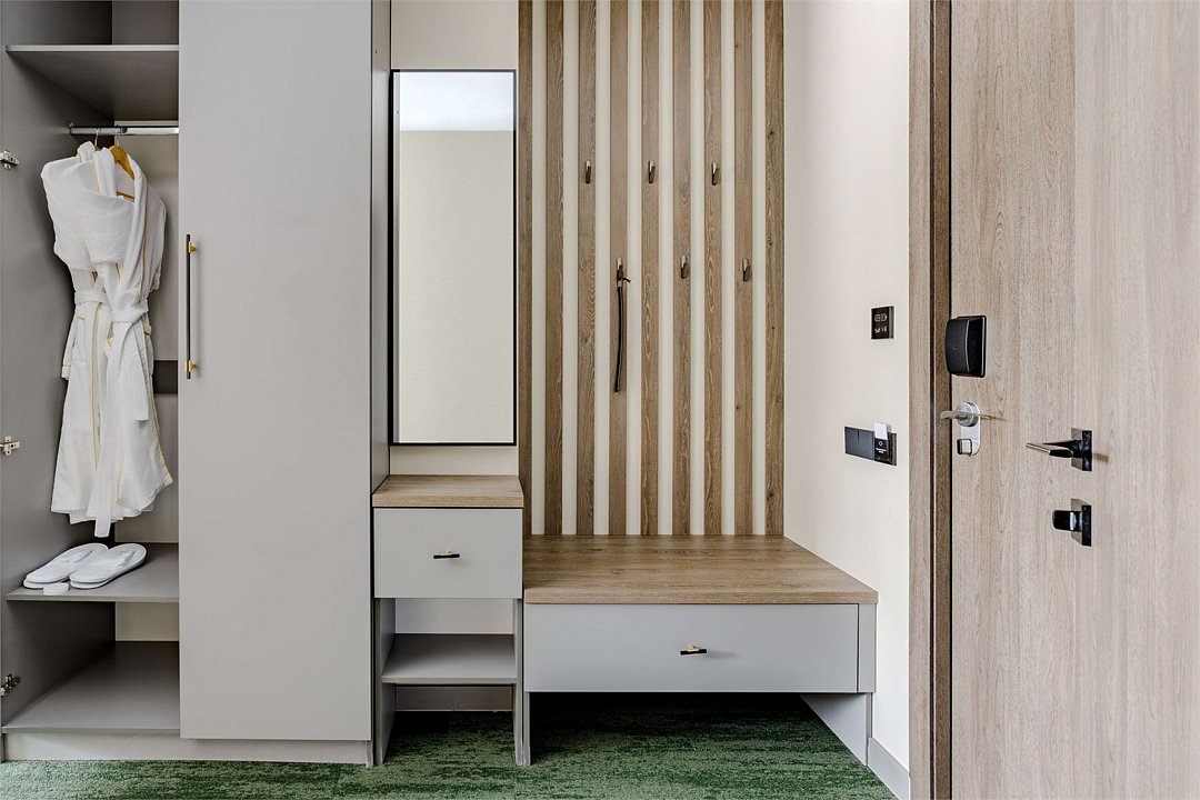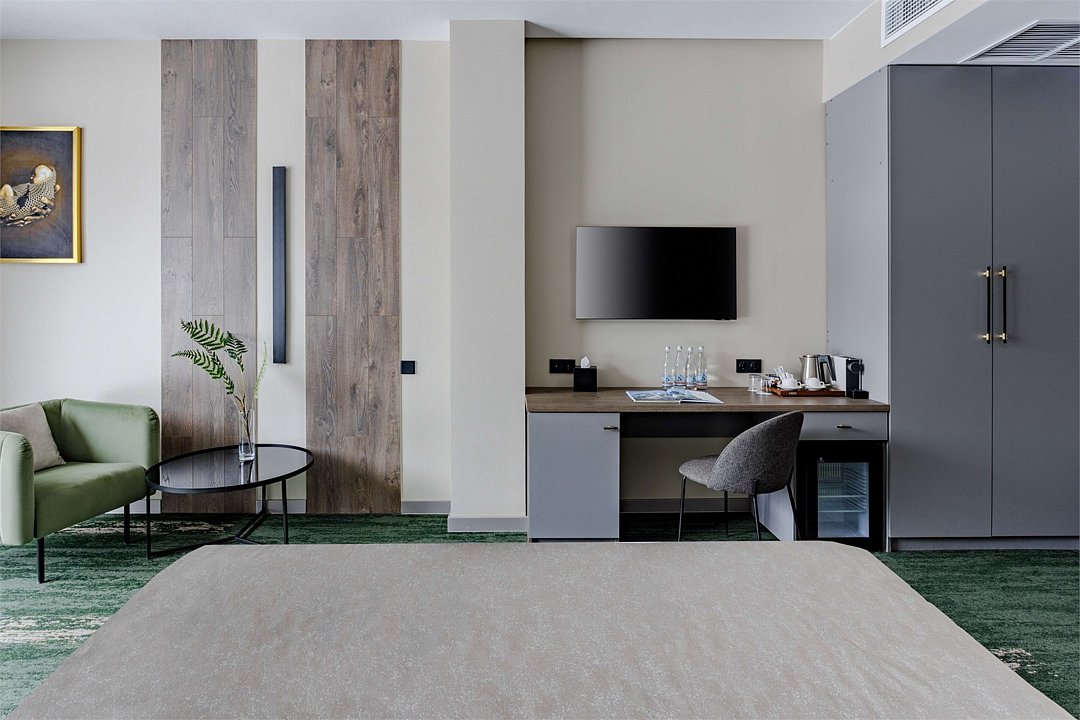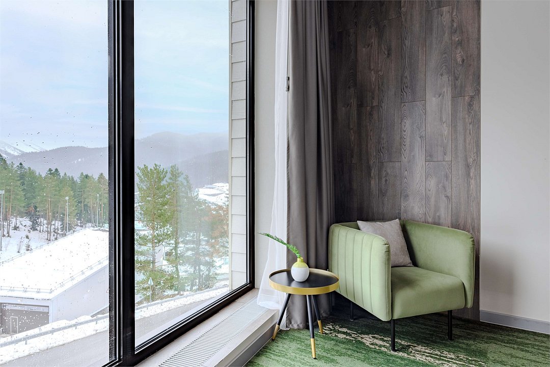 Wi-Fi, светильник, фен, весы, кофемашина, утюг, душевая кабина, санузел, теплый пол, халаты, тапочки, косметические средства, двуспальная кровать, две односпальные кровати, гладильная доска, диван, шкаф для одежды, вешалки, багажная тумба, зеркало, сейф, раковина, питьевая вода, ковровое покрытие, кресло, центральное кондиционирование, стаканы, стул, тумба, цифровое тв, диван-кровать, раскладной диван, внутренний телефон, вид на горы, вид на лес, рабочий стол, чайная станция, вешалки-плечики, бутилированная вода, СПА, шапочка для душа, мыло, без питомцевВ гостиничном номере