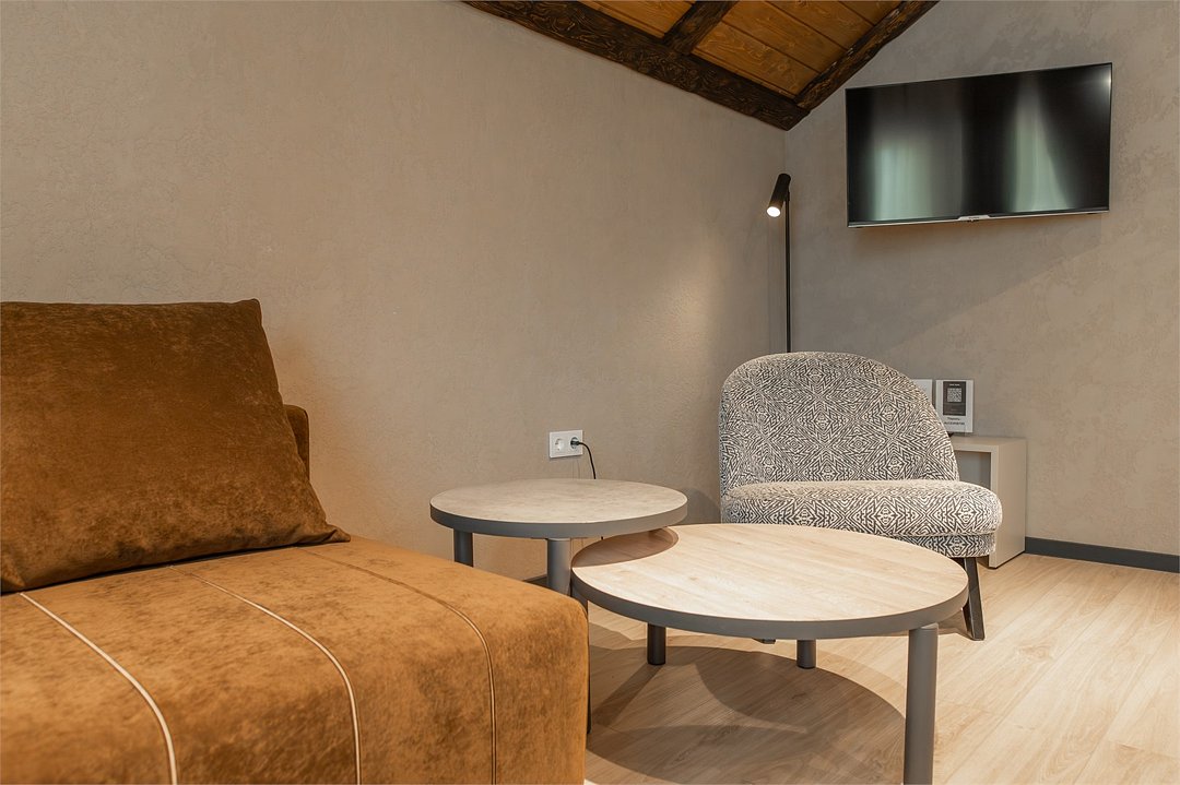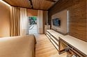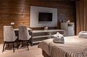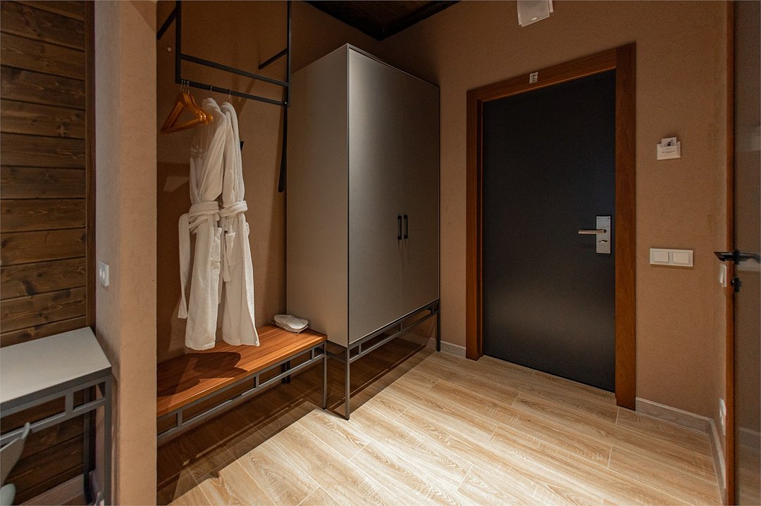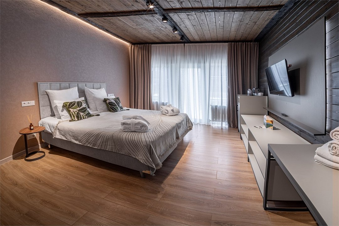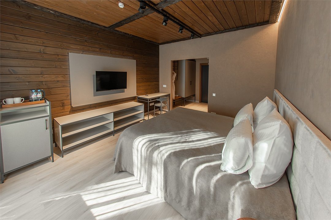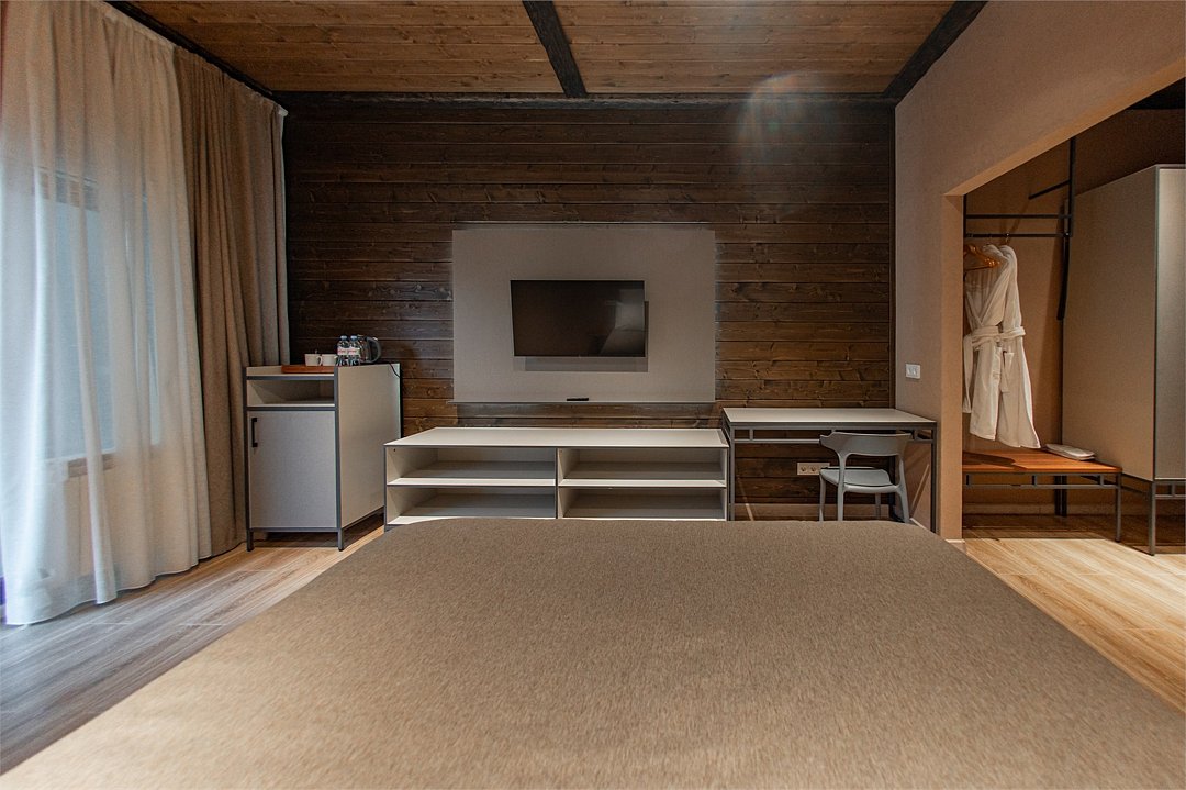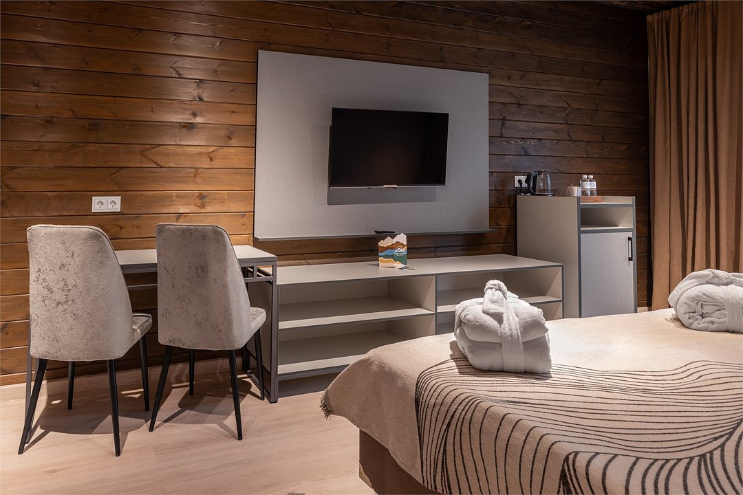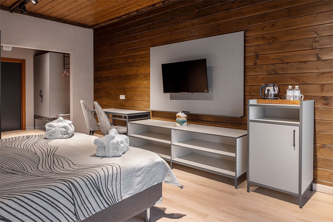 два телевизора, Wi-Fi, фен, утюг, душевая кабина, теплый пол, халаты, банные полотенца, тапочки, косметические средства, балкон, две односпальные или большая двуспальная кровать, шкаф для одежды, вешалки, багажная тумба, зеркало, комод, чайник, унитаз, раковина, душ, вид во двор, две кровати «King size», стаканы, стул, панорамные окна, мини-холодильник, вид на горы, телевизор со Smart TV, теплые полы, вид на лес, рабочий стол, гигиенический душ, уборка номера, набор для приготовления чая и кофе, туалетные принадлежности премиум-класса, бутилированная вода, мини-бар (платно), мыло, затемняющая штора, открытый шкаф, можно с питомцами, лежанка, мискаВ гостиничном номере