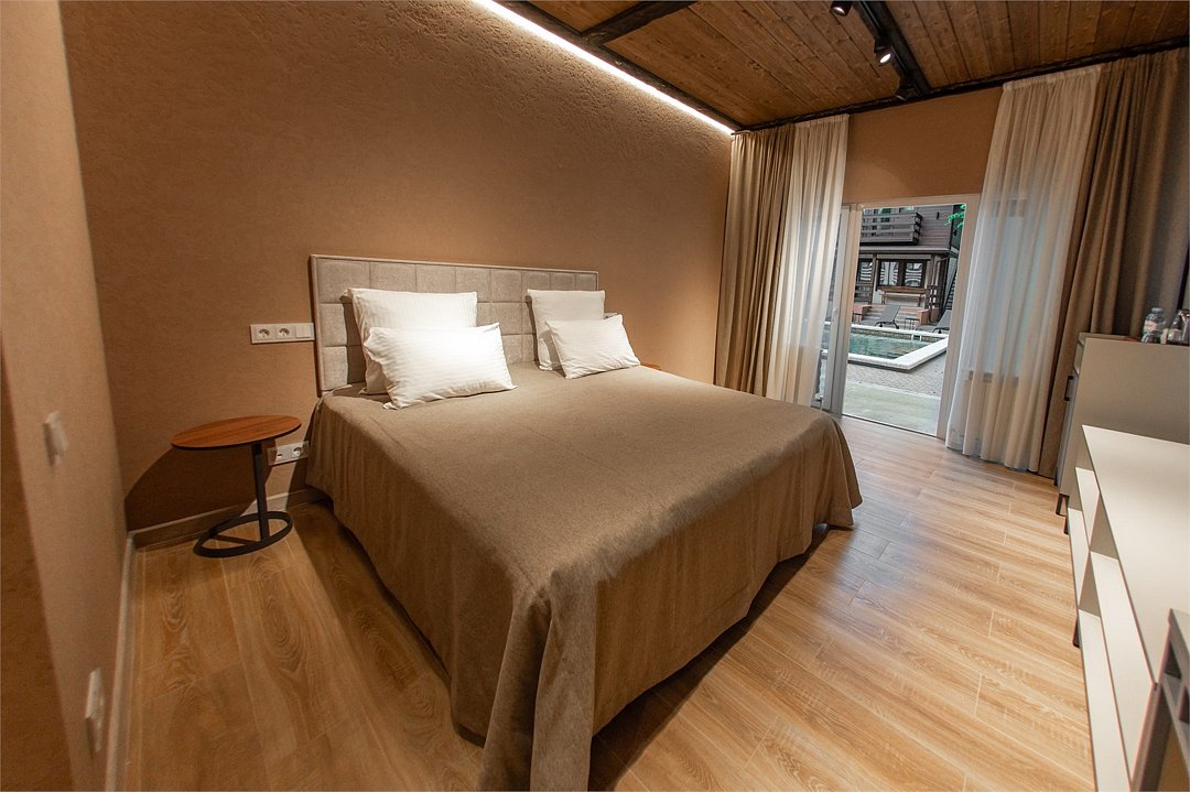 Wi-Fi, фен, утюг, душевая кабина, теплый пол, халаты, две односпальные кровати, ортопедический матрас, шкаф для одежды, зеркало, унитаз, раковина, питьевая вода, отопление, отдельный вход в номер, вид во двор, стаканы, стул, панорамные окна, мини-холодильник, телевизор со Smart TV, теплые полы, вид на бассейн, рабочий стол, набор для приготовления чая и кофе, туалетные принадлежности премиум-класса, прачечная (за дополнительную плату), можно с питомцами, лежанка, мискаВ гостиничном номере
