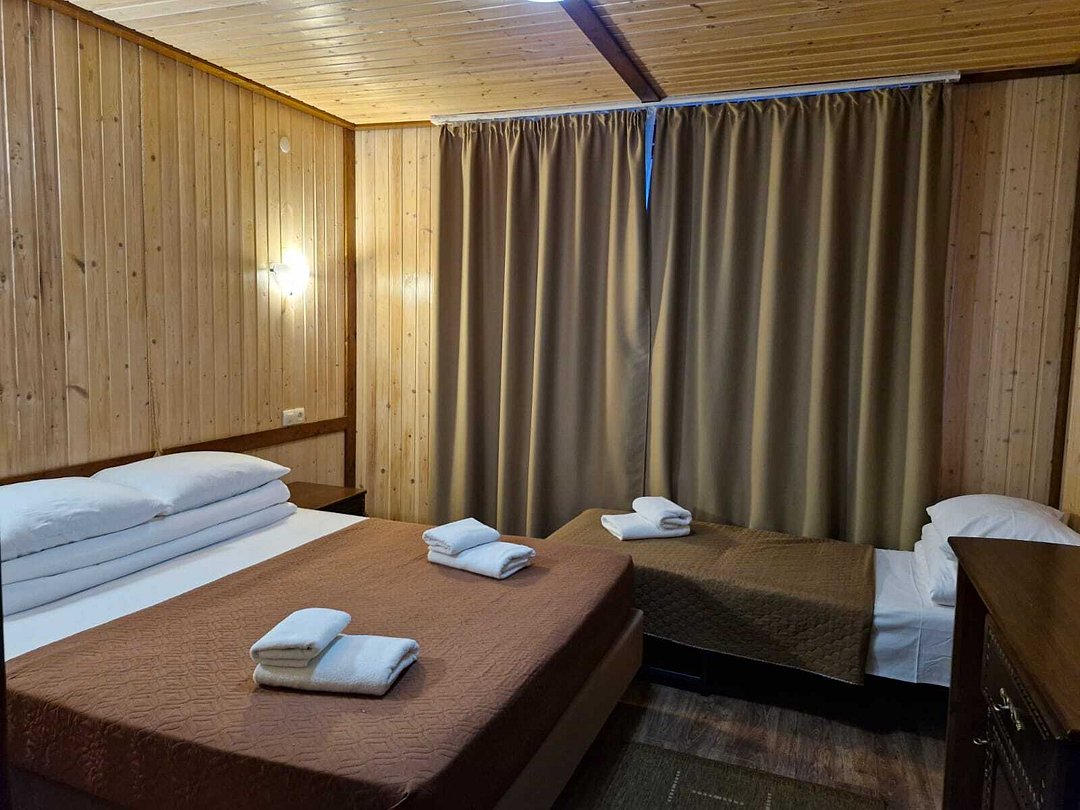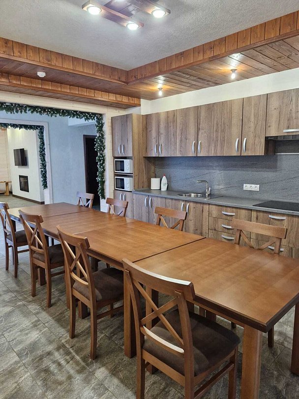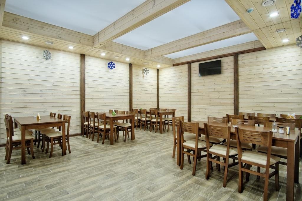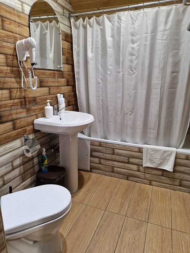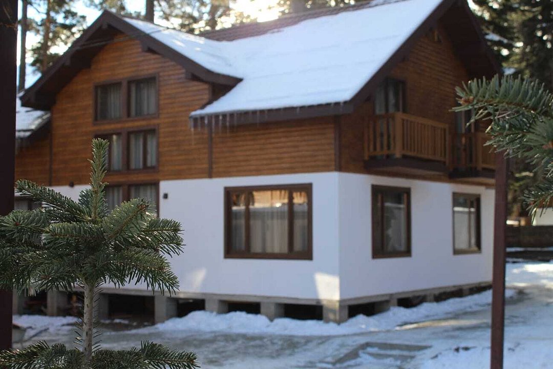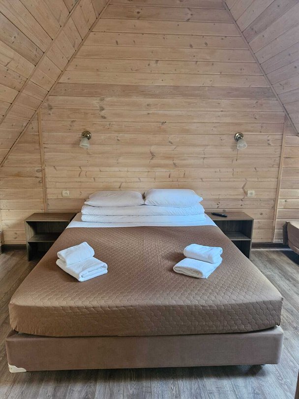 Путешествие с семьейНеожиданно хорошоСимпатичный отель, с множеством вариаций размещения. Есть обычные номера в большом доме на 2-3 человека, есть семейные домики на 2 семьи. 4 бани на территории. Своя столовая. По желанию можно готовить самим на кухне в главном доме. Мангальная зона. Территория не маленькая, правда пока ещё в небольшом строительном беспорядке, но все очень аккуратно. Есть трансфер, по всей видимости до подъемников, либо до аэропорта.
