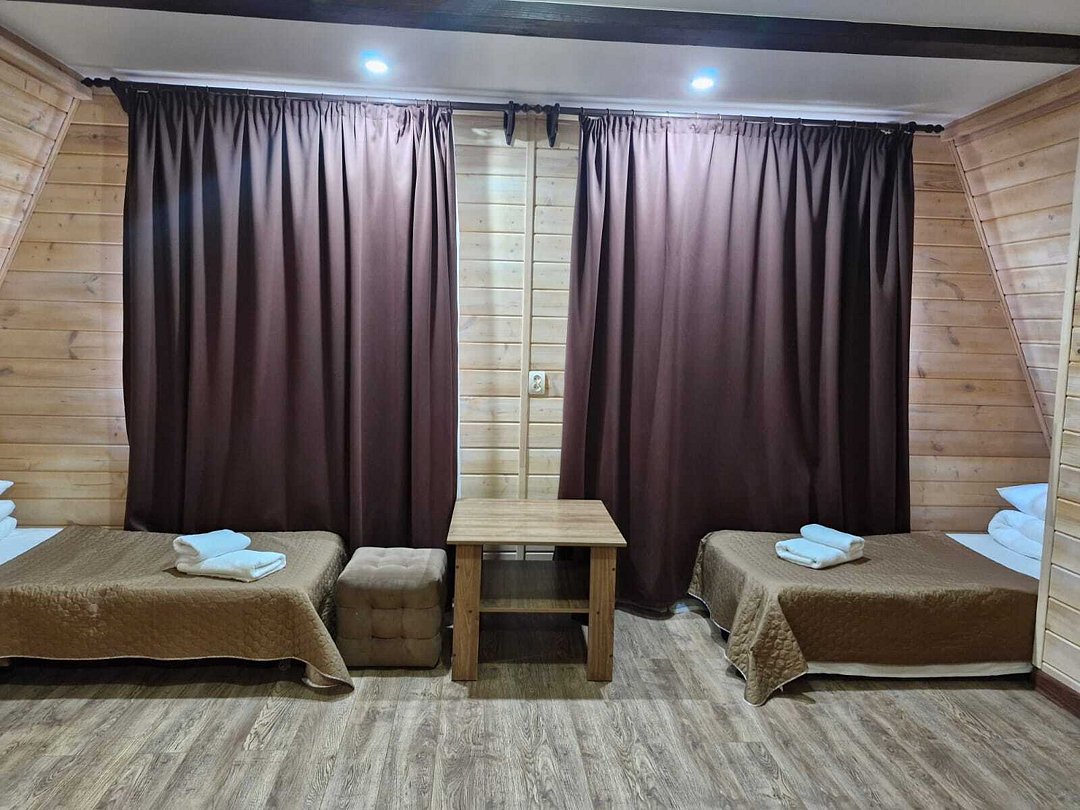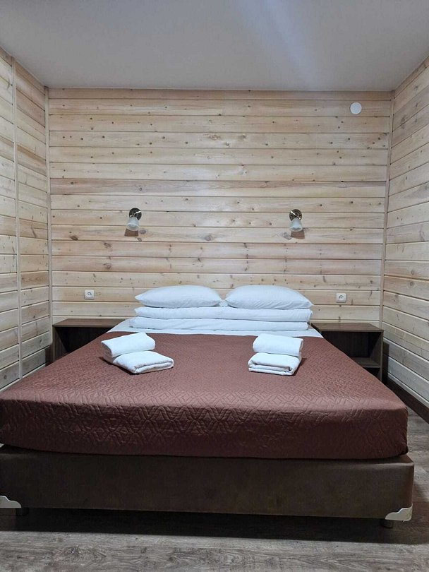 Три просторных номера Стандарт с отдельным санузлом и креслом-кроватью и семейный двухкомнатный номер с двумя двуспальными кроватями и двумя креслами. Беседка с мангалом.