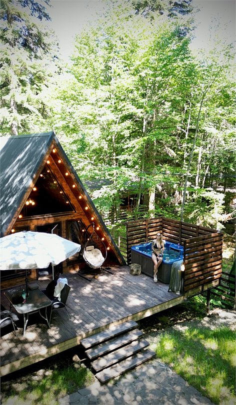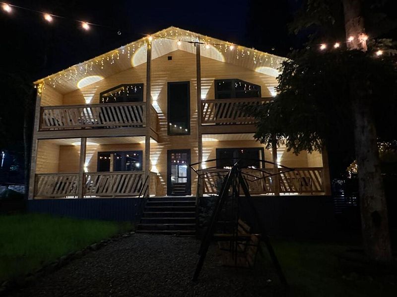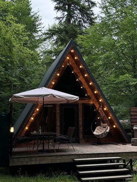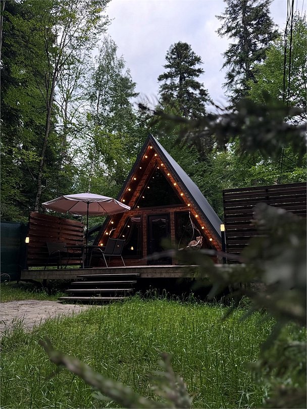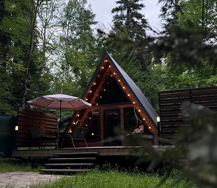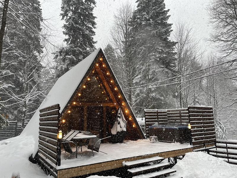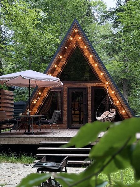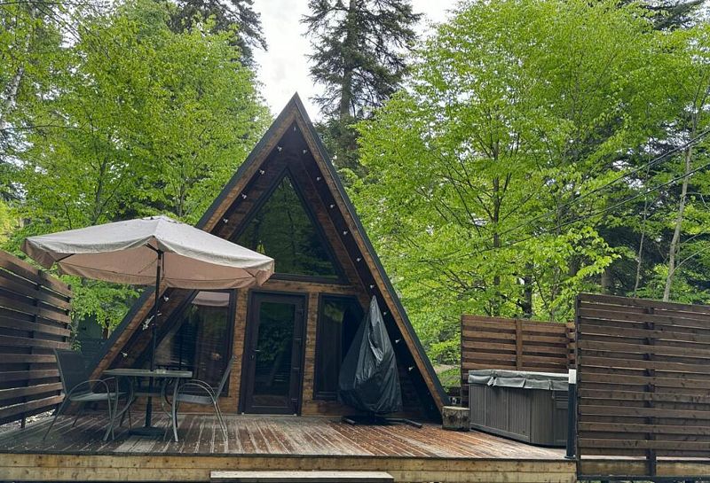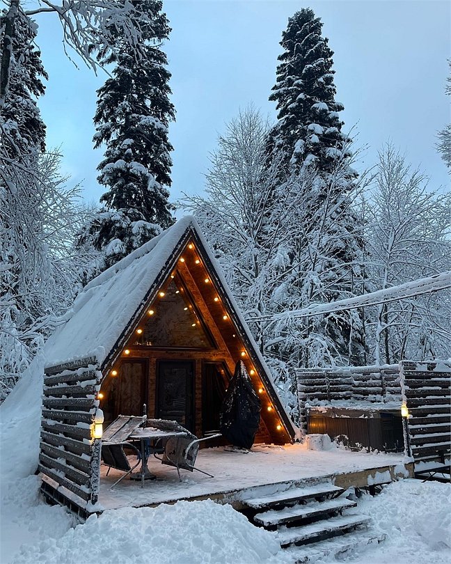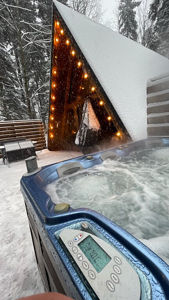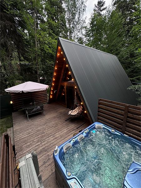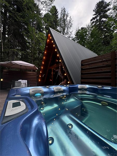 Новый коттедж A-Frame со своим СПА бассейном-джакузи до 40 градусов подогрева! Расположен на территории гостевого комплекса, но при этом огорожен своей территорией! Красивый многовековой лес, вдали от остальных домов. Дом оборудован всем необходимым для комфортного отдыха, своя терраса с мебелью и качелей, зона для барбекю. Дом оборудован уличным профессиональным Спа-бассейном с подогревом воды круглосуточно с функциями джакузи, где вы можете купаться и наслаждаться атмосферой окружающей природы круглый год. На территории комплекса имеется стоянка, прокат лыж и бордов, костровая зона, детская площадка, (баня на дровах с бассейном оплачивается отдельно)Услуги и удобства
