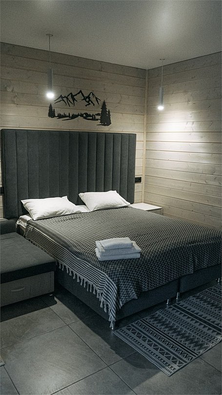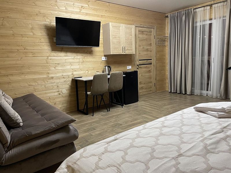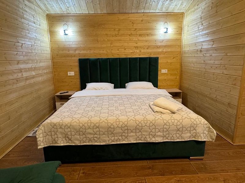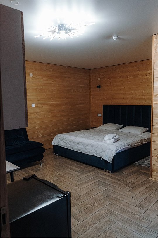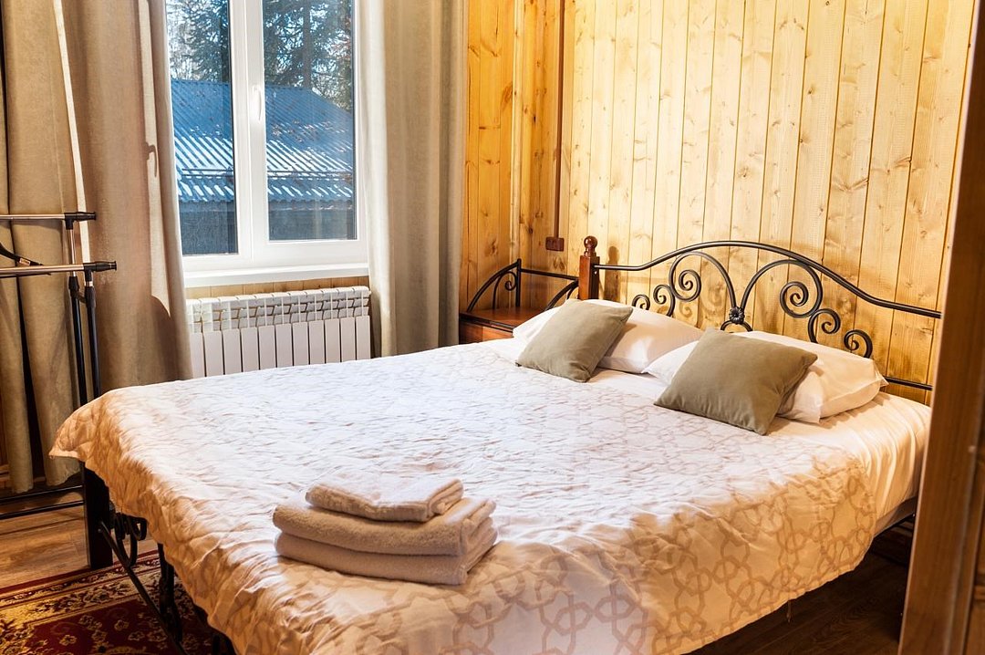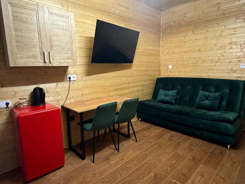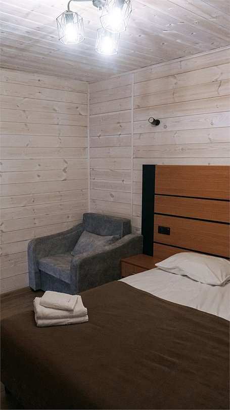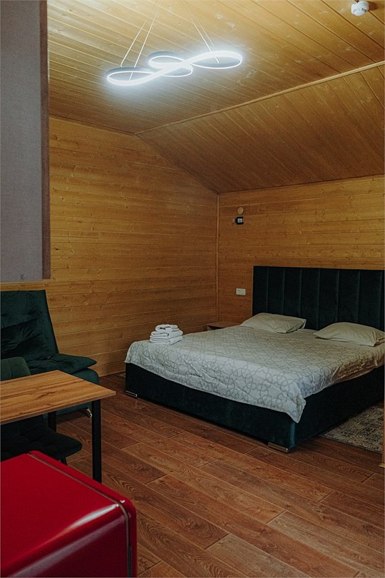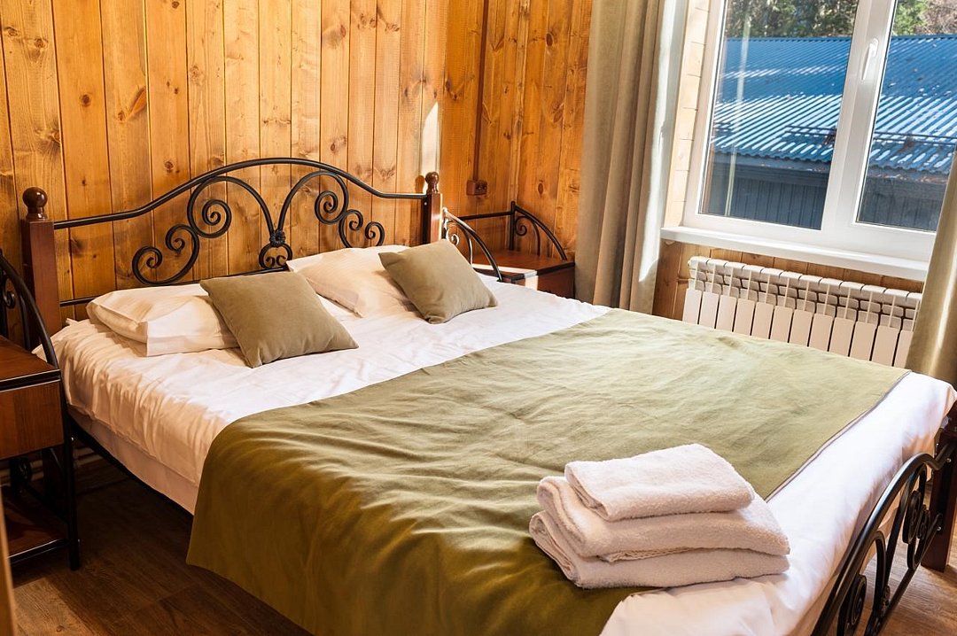 Новые номера со всеми удобствами для комфортного проживания. Свой санузел, теплые полы, свой балкон, посуда, чайник, холодильник, большая кровать, раскладной диван. Столовая, детская площадка, зона для костра, парковка, wi-fi входит в стоимость номера. На территории есть баня на дровах и чан за отдельную плату.Услуги и удобства