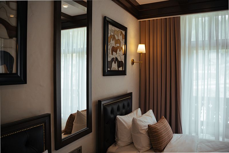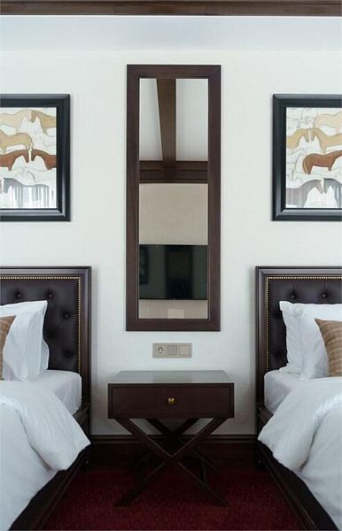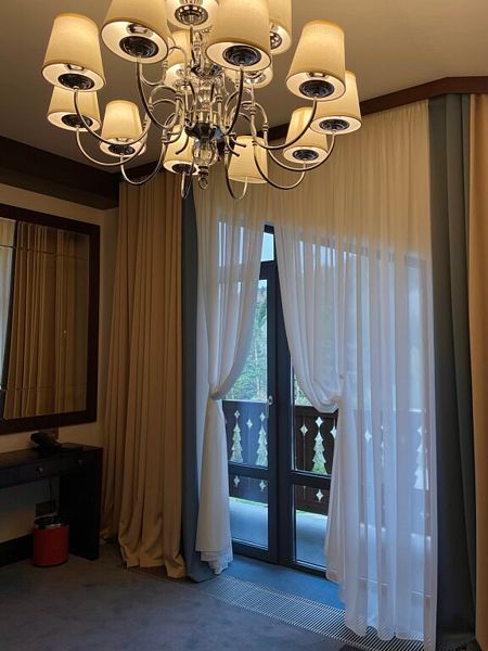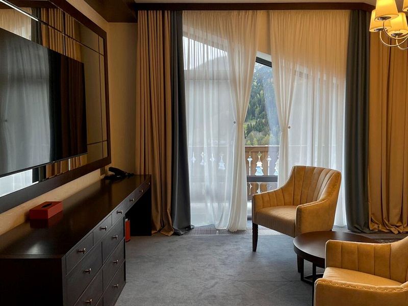 телевизор, Wi-Fi, IP-телефон, холодильник, фен, электронные замки, кофемашина, утюг, ванна или душевая кабина, халаты, тапочки, балкон, две односпальные кровати, шкаф для одежды, вешалки, багажная тумба, зеркало, эксклюзивная мебель, мини-бар, сейф, унитаз, раковина, туалетный столик, стол, туалетные средства, внутренний телефон, вид на горы, пуфик, рабочий стол, гигиенический душ, туалетные принадлежности премиум-класса, вешалки-плечики, бутилированная вода, СПА, шапочка для душа, мыло, окна от пола до потолкаВ гостиничном номере