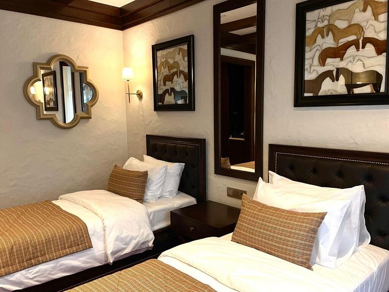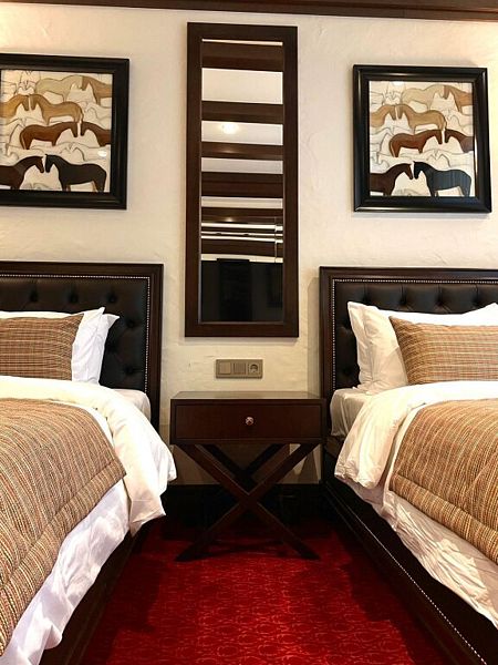 Двухместный номер с двумя односпальными кроватями. В номере есть все необходимое для комфортного проживания: кофе- машина, мини- холодильник, гладильные принадлежности, фен, косметические средства, полотенца, халат и тапочки, климат-контроль, сейф, телефон, Wi-Fi, питьевая вода. В каждом номере балкон с видом на горы. Ортопедические матрасы сделают ваш сон спокойным и крепким, а утром Вы проснетесь отдохнувшим и с прекрасными настроением.Услуги и удобства