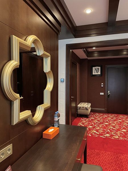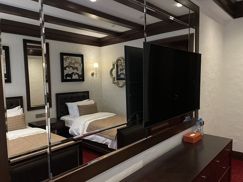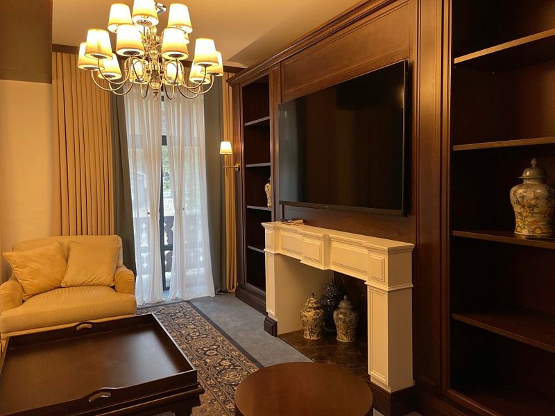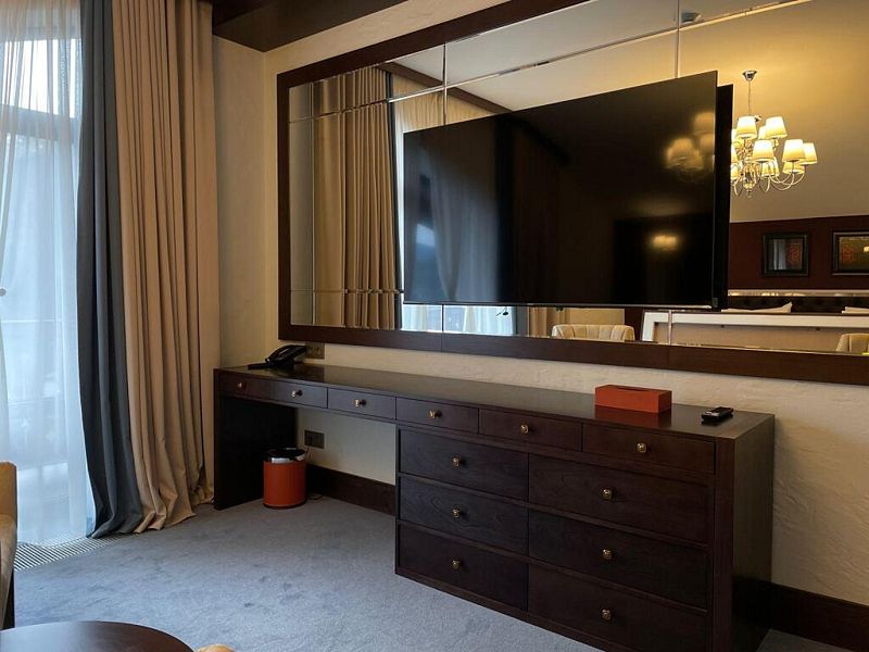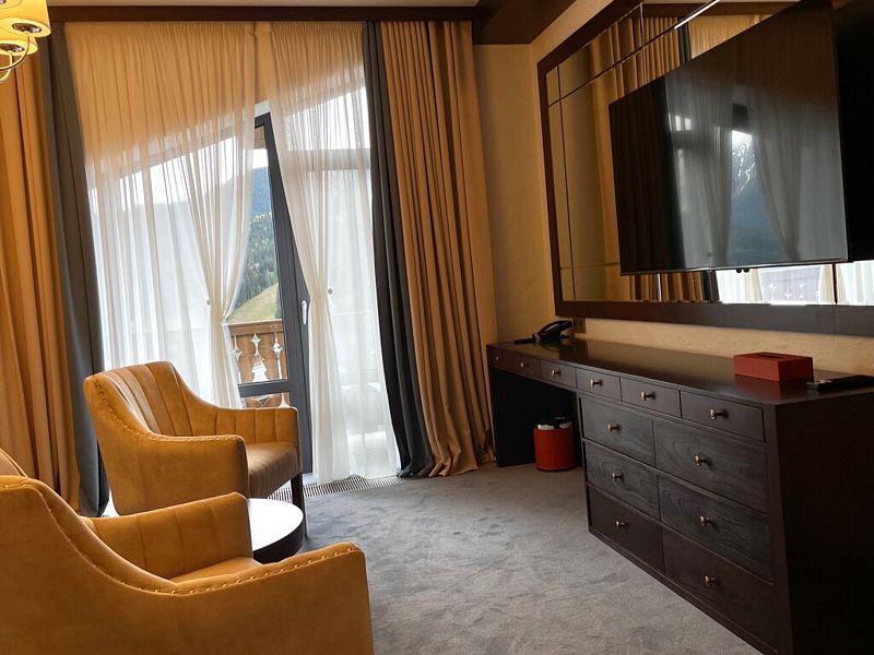 телевизор, Wi-Fi, интернет, телефон, IP-телефон, холодильник, фен, электронные замки, утюг, душевая кабина, халаты, тапочки, косметические средства, балкон, двуспальная кровать, гладильная доска, диван, шкаф для одежды, письменный стол, багажная тумба, зеркало, эксклюзивная мебель, мини-бар, сейф, унитаз, раковина, душ, стол, тумба, туалет, раскладной диван, внутренний телефон, вид на горы, пуфик, гигиенический душ, туалетные принадлежности премиум-класса, вешалки-плечики, бутилированная вода, СПАВ гостиничном номере