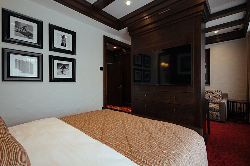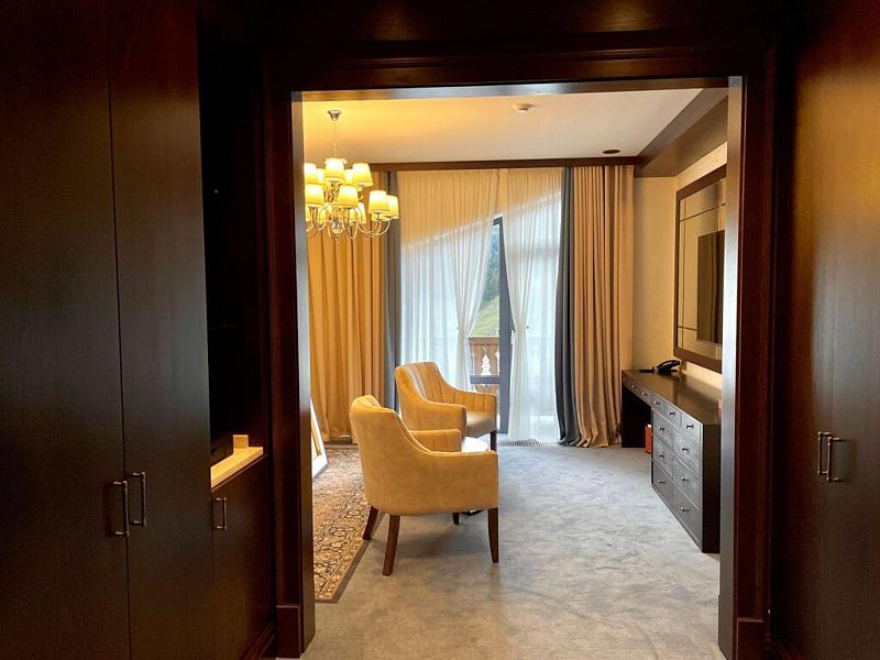 телевизор, Wi-Fi, интернет, IP-телефон, холодильник, фен, электронные замки, кофемашина, утюг, душевая кабина, ванна или душевая кабина, халаты, банные полотенца, тапочки, балкон, двуспальная кровать, гладильная доска, шкаф для одежды, вешалки, письменный стол, багажная тумба, комод, эксклюзивная мебель, сейф, унитаз, раковина, душ, туалет, телевизор с плоским экраном, вид на горы, вид на лес, пуфик, гигиенический душ, туалетные принадлежности премиум-класса, вешалки-плечики, бутилированная вода, СПА, шапочка для душа, окна от пола до потолкаВ гостиничном номере