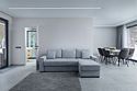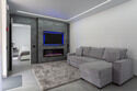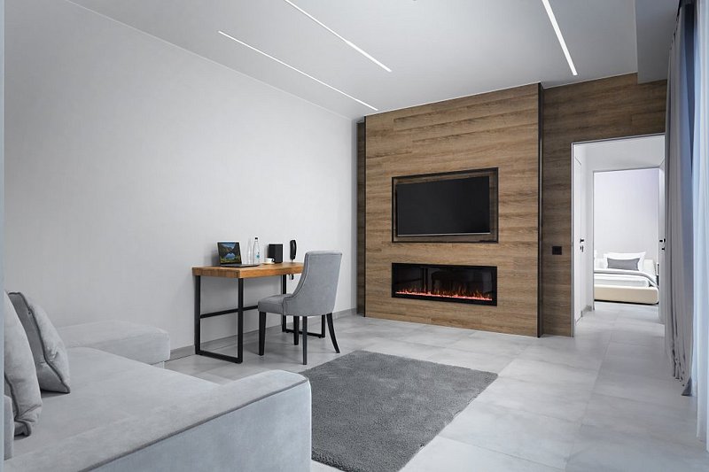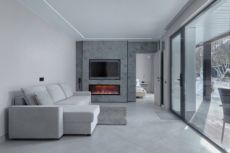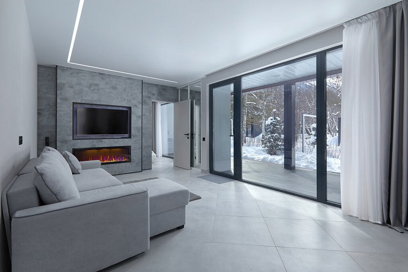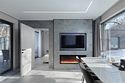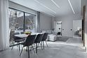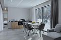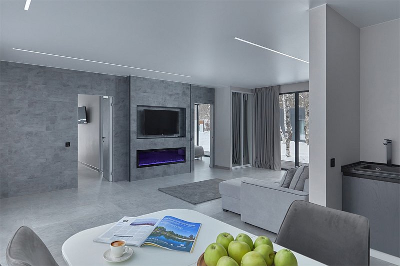 Сдержанная гамма интерьеров дополняется теплым огнем камина и идеально сочетается с открывающимися панорамами белоснежных гор с террасы.