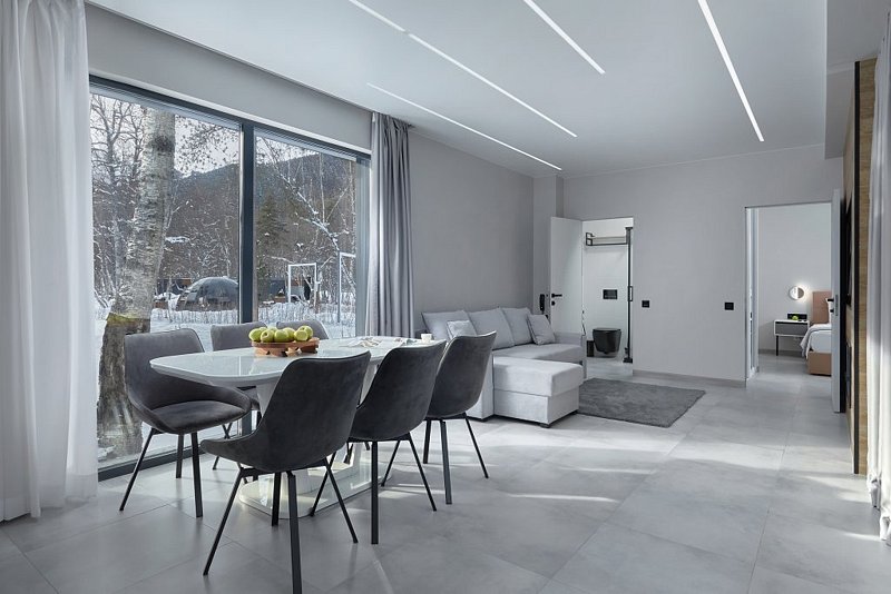 Резиденция SUITE включает в себя просторную открытую террасу для загара летом, незабываемых семейных вечеров или ярких вечеринок с друзьями. Для тех, кто ценит премиальный отдых и комфорт каждого мгновения. Идеально подходит как для насыщенного, так и уединенного уикенда в кругу близких. С террасы открывается великолепный вид на величественные склоны гор и удивительно яркие звезды.